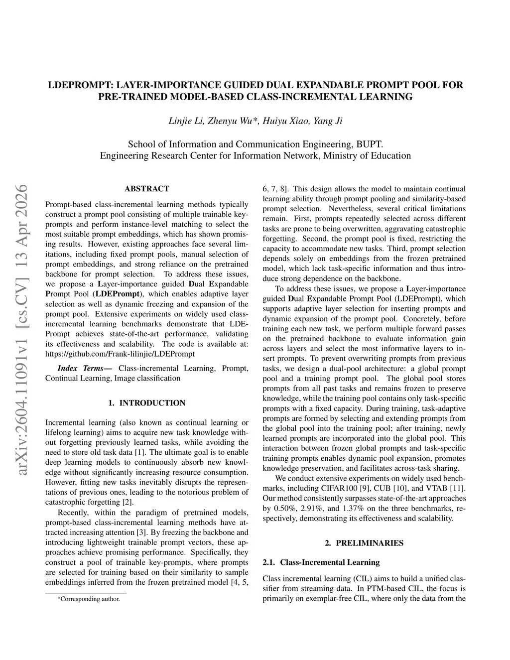 Prompt-based class-incremental learning methods typically construct a prompt pool consisting of multiple trainable key-prompts and perform instance-level matching to select the most suitable prompt embeddings, which has shown promising results. However, existing approaches face several limitations, including fixed prompt pools, manual selection of prompt embeddings, and strong reliance on the pretrained backbone for prompt selection. To address these issues, we propose a \textbf{L}ayer-importance guided \textbf{D}ual \textbf{E}xpandable \textbf{P}rompt Pool (\textbf{LDEPrompt}), which enables adaptive layer selection as well as dynamic freezing and expansion of the prompt pool. Extensive experiments on widely used class-incremental learning benchmarks demonstrate that LDEPrompt achieves state-of-the-art performance, validating its effectiveness and scalability.