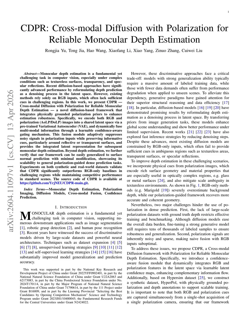 CDPR: Cross-modal Diffusion with Polarization for Reliable Monocular Depth Estimation