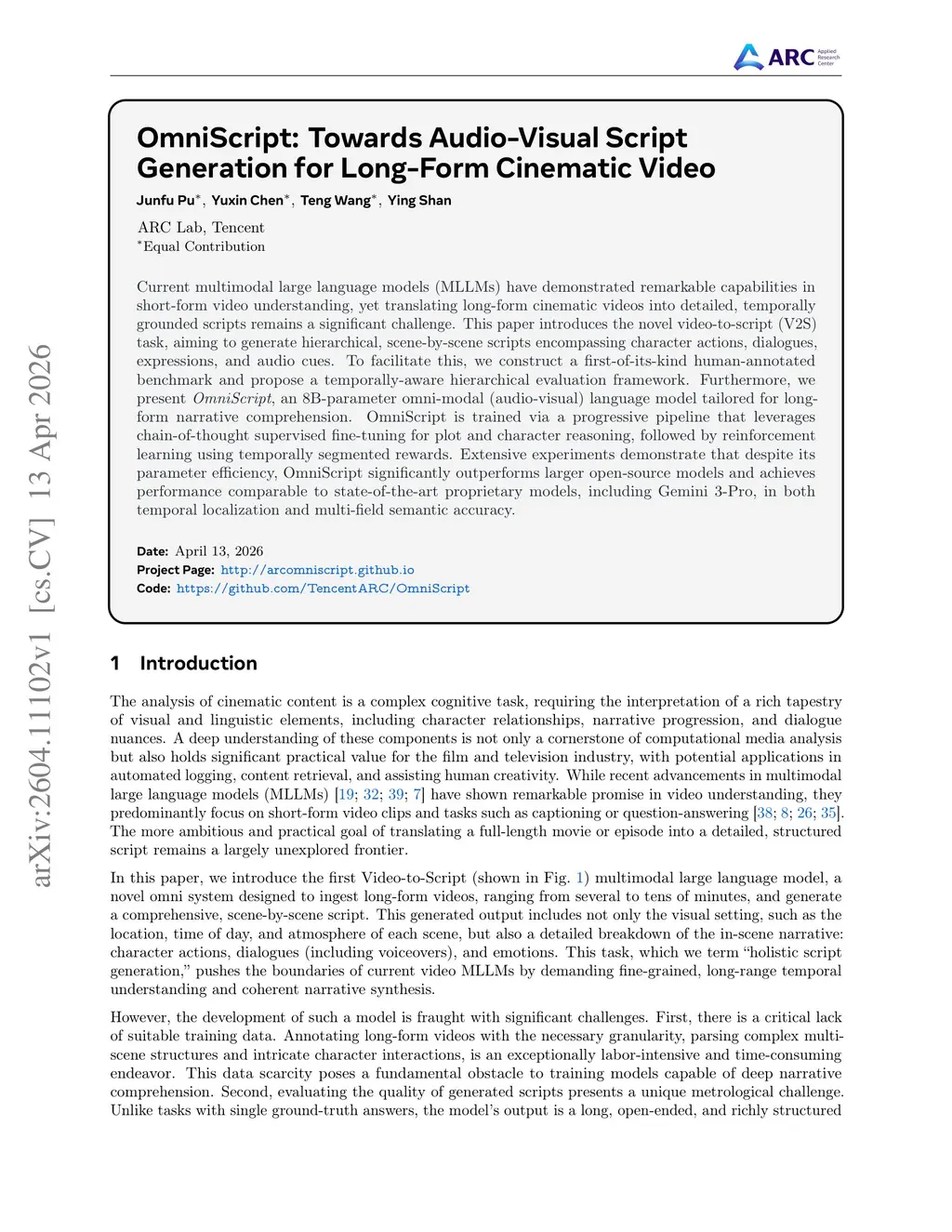 Current multimodal large language models (MLLMs) have demonstrated remarkable capabilities in short-form video understanding, yet translating long-form cinematic videos into detailed, temporally grounded scripts remains a significant challenge. This paper introduces the novel video-to-script (V2S) task, aiming to generate hierarchical, scene-by-scene scripts encompassing character actions, dialogues, expressions, and audio cues. To facilitate this, we construct a first-of-its-kind human-annotated benchmark and propose a temporally-aware hierarchical evaluation framework. Furthermore, we present OmniScript, an 8B-parameter omni-modal (audio-visual) language model tailored for long-form narrative comprehension. OmniScript is trained via a progressive pipeline that leverages chain-of-thought supervised fine-tuning for plot and character reasoning, followed by reinforcement learning using temporally segmented rewards. Extensive experiments demonstrate that despite its parameter efficiency, OmniScript significantly outperforms larger open-source models and achieves performance comparable to state-of-the-art proprietary models, including Gemini 3-Pro, in both temporal localization and multi-field semantic accuracy.
