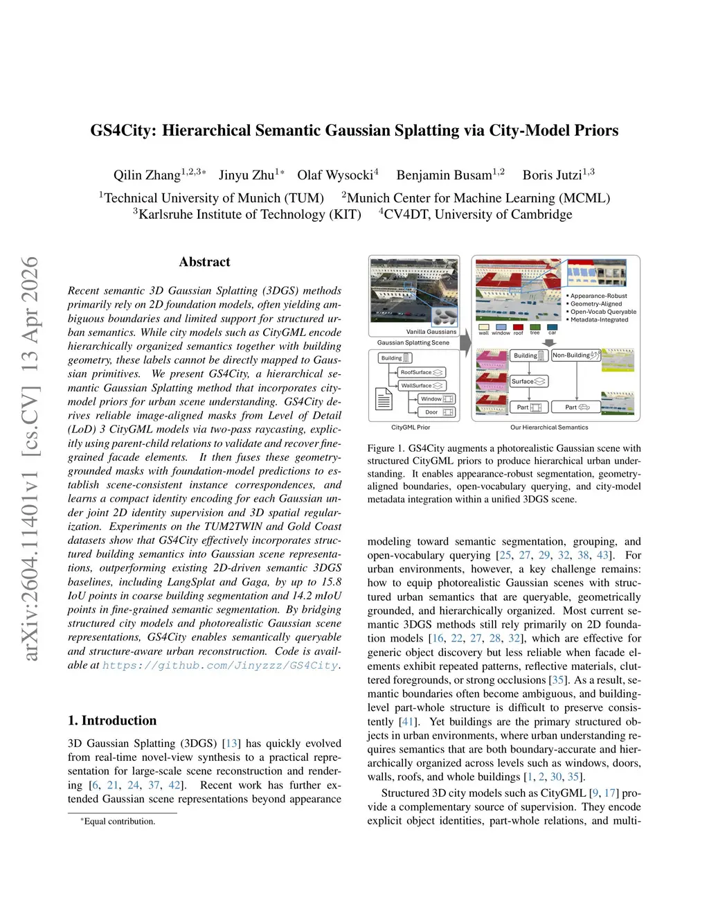 Recent semantic 3D Gaussian Splatting (3DGS) methods primarily rely on 2D foundation models, often yielding ambiguous boundaries and limited support for structured urban semantics. While city models such as CityGML encode hierarchically organized semantics together with building geometry, these labels cannot be directly mapped to Gaussian primitives. We present GS4City, a hierarchical semantic Gaussian Splatting method that incorporates city-model priors for urban scene understanding. GS4City derives reliable image-aligned masks from Level of Detail (LoD) 3 CityGML models via two-pass raycasting, explicitly using parent-child relations to validate and recover fine-grained facade elements. It then fuses these geometry-grounded masks with foundation-model predictions to establish scene-consistent instance correspondences, and learns a compact identity encoding for each Gaussian under joint 2D identity supervision and 3D spatial regularization. Experiments on the TUM2TWIN and Gold Coast datasets show that GS4City effectively incorporates structured building semantics into Gaussian scene representations, outperforming existing 2D-driven semantic 3DGS baselines, including LangSplat and Gaga, by up to 15.8 IoU points in coarse building segmentation and 14.2 mIoU points in fine-grained semantic segmentation. By bridging structured city models and photorealistic Gaussian scene representations, GS4City enables semantically queryable and structure-aware urban reconstruction. Code is available atthis https URL.