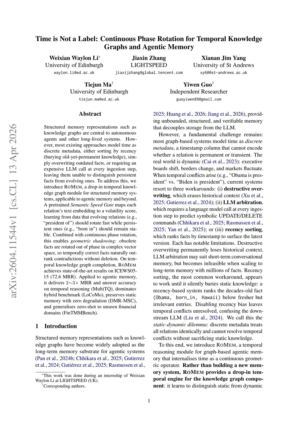Structured memory representations such as knowledge graphs are central to autonomous agents and other long-lived systems. However, most existing approaches model time as discrete metadata, either sorting by recency (burying old-yet-permanent knowledge), simply overwriting outdated facts, or requiring an expensive LLM call at every ingestion step, leaving them unable to distinguish persistent facts from evolving ones. To address this, we introduce RoMem, a drop-in temporal knowledge graph module for structured memory systems, applicable to agentic memory and beyond. A pretrained Semantic Speed Gate maps each relation's text embedding to a volatility score, learning from data that evolving relations (e.g., "president of") should rotate fast while persistent ones (e.g., "born in") should remain stable. Combined with continuous phase rotation, this enables geometric shadowing: obsolete facts are rotated out of phase in complex vector space, so temporally correct facts naturally outrank contradictions without deletion. On temporal knowledge graph completion, RoMem achieves state-of-the-art results on ICEWS05-15 (72.6 MRR). Applied to agentic memory, it delivers 2-3x MRR and answer accuracy on temporal reasoning (MultiTQ), dominates hybrid benchmark (LoCoMo), preserves static memory with zero degradation (DMR-MSC), and generalises zero-shot to unseen financial domains (FinTMMBench).