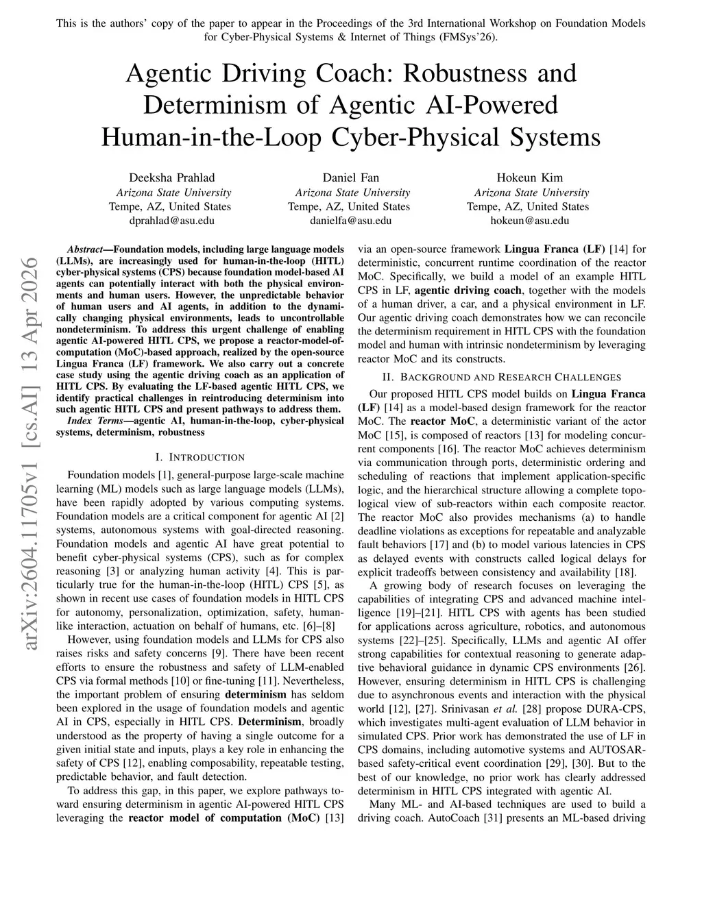 Foundation models, including large language models (LLMs), are increasingly used for human-in-the-loop (HITL) cyber-physical systems (CPS) because foundation model-based AI agents can potentially interact with both the physical environments and human users. However, the unpredictable behavior of human users and AI agents, in addition to the dynamically changing physical environments, leads to uncontrollable nondeterminism. To address this urgent challenge of enabling agentic AI-powered HITL CPS, we propose a reactor-model-of-computation (MoC)-based approach, realized by the open-source Lingua Franca (LF) framework. We also carry out a concrete case study using the agentic driving coach as an application of HITL CPS. By evaluating the LF-based agentic HITL CPS, we identify practical challenges in reintroducing determinism into such agentic HITL CPS and present pathways to address them.