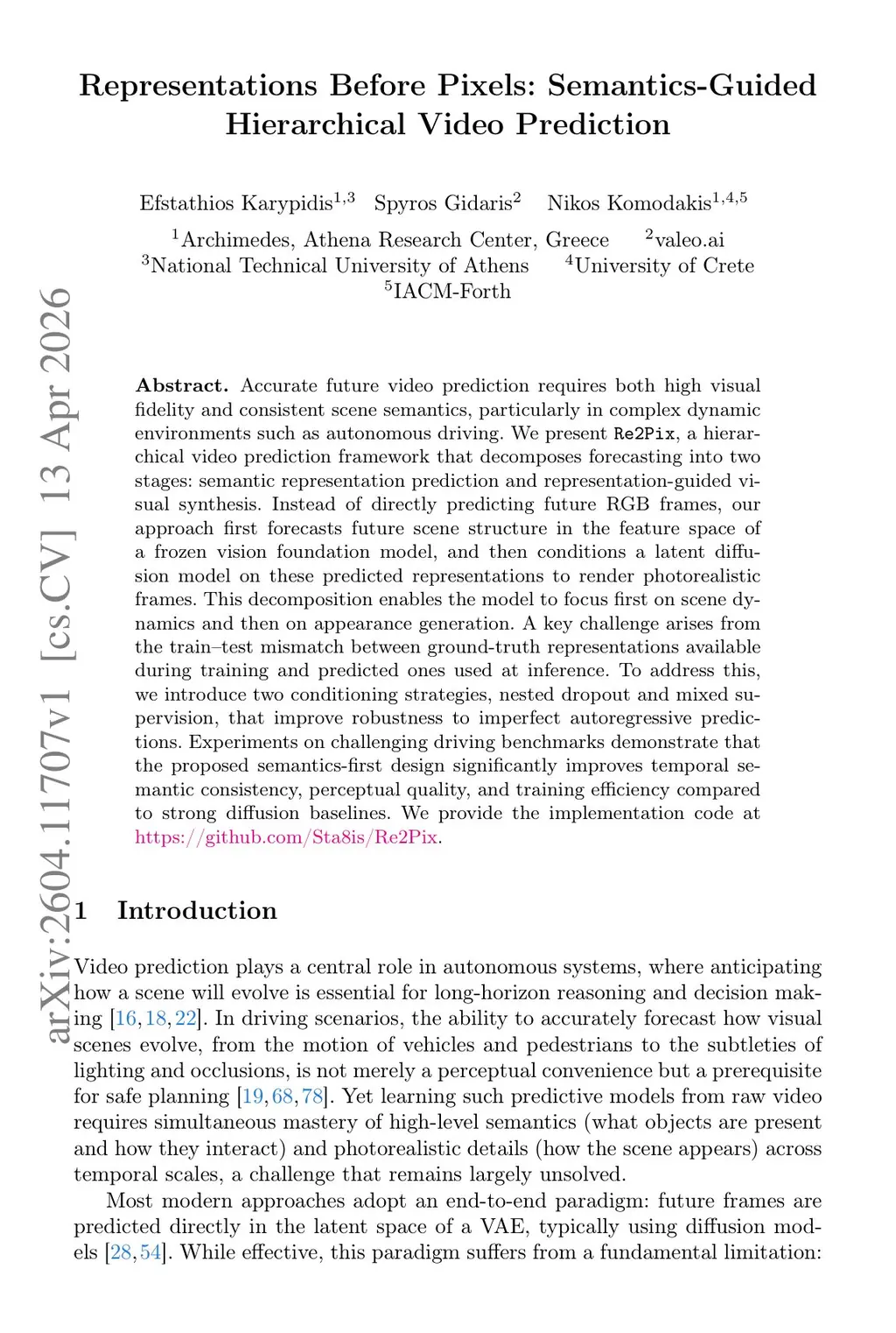 Accurate future video prediction requires both high visual fidelity and consistent scene semantics, particularly in complex dynamic environments such as autonomous driving. We present Re2Pix, a hierarchical video prediction framework that decomposes forecasting into two stages: semantic representation prediction and representation-guided visual synthesis. Instead of directly predicting future RGB frames, our approach first forecasts future scene structure in the feature space of a frozen vision foundation model, and then conditions a latent diffusion model on these predicted representations to render photorealistic frames. This decomposition enables the model to focus first on scene dynamics and then on appearance generation. A key challenge arises from the train-test mismatch between ground-truth representations available during training and predicted ones used at inference. To address this, we introduce two conditioning strategies, nested dropout and mixed supervision, that improve robustness to imperfect autoregressive predictions. Experiments on challenging driving benchmarks demonstrate that the proposed semantics-first design significantly improves temporal semantic consistency, perceptual quality, and training efficiency compared to strong diffusion baselines. We provide the implementation code atthis https URL