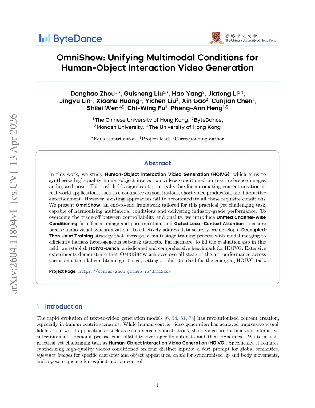 In this work, we study Human-Object Interaction Video Generation (HOIVG), which aims to synthesize high-quality human-object interaction videos conditioned on text, reference images, audio, and pose. This task holds significant practical value for automating content creation in real-world applications, such as e-commerce demonstrations, short video production, and interactive entertainment. However, existing approaches fail to accommodate all these requisite conditions. We present OmniShow, an end-to-end framework tailored for this practical yet challenging task, capable of harmonizing multimodal conditions and delivering industry-grade performance. To overcome the trade-off between controllability and quality, we introduce Unified Channel-wise Conditioning for efficient image and pose injection, and Gated Local-Context Attention to ensure precise audio-visual synchronization. To effectively address data scarcity, we develop a Decoupled-Then-Joint Training strategy that leverages a multi-stage training process with model merging to efficiently harness heterogeneous sub-task datasets. Furthermore, to fill the evaluation gap in this field, we establish HOIVG-Bench, a dedicated and comprehensive benchmark for HOIVG. Extensive experiments demonstrate that OmniShow achieves overall state-of-the-art performance across various multimodal conditioning settings, setting a solid standard for the emerging HOIVG task.