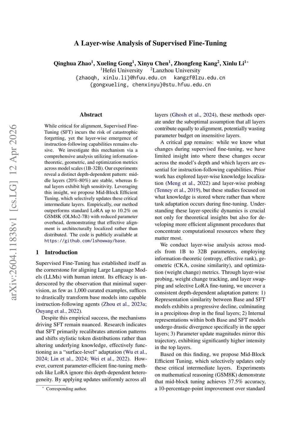 While critical for alignment, Supervised Fine-Tuning (SFT) incurs the risk of catastrophic forgetting, yet the layer-wise emergence of instruction-following capabilities remains elusive. We investigate this mechanism via a comprehensive analysis utilizing information-theoretic, geometric, and optimization metrics across model scales (1B-32B). Our experiments reveal a distinct depth-dependent pattern: middle layers (20\%-80\%) are stable, whereas final layers exhibit high sensitivity. Leveraging this insight, we propose Mid-Block Efficient Tuning, which selectively updates these critical intermediate layers. Empirically, our method outperforms standard LoRA up to 10.2\% on GSM8K (OLMo2-7B) with reduced parameter overhead, demonstrating that effective alignment is architecturally localized rather than distributed. The code is publicly available atthis https URL.