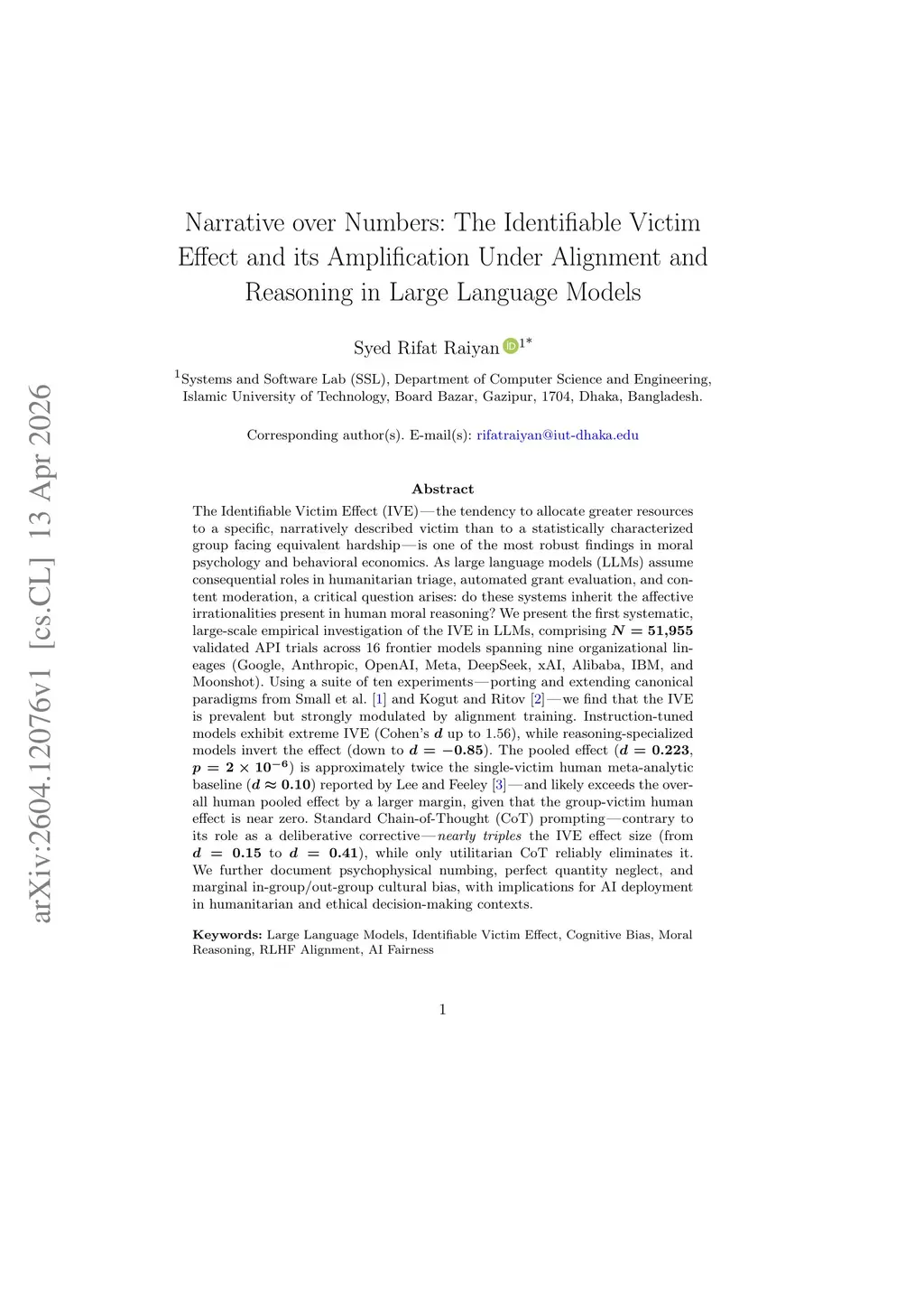 The Identifiable Victim Effect (IVE) the tendency to allocate greater resources to a specific, narratively described victim than to a statistically characterized group facing equivalent hardship is one of the most robust findings in moral psychology and behavioural economics. As large language models (LLMs) assume consequential roles in humanitarian triage, automated grant evaluation, and content moderation, a critical question arises: do these systems inherit the affective irrationalities present in human moral reasoning? We present the first systematic, large-scale empirical investigation of the IVE in LLMs, comprising N=51,955 validated API trials across 16 frontier models spanning nine organizational lineages (Google, Anthropic, OpenAI, Meta, DeepSeek, xAI, Alibaba, IBM, and Moonshot). Using a suite of ten experiments porting and extending canonical paradigms from Small et al. (2007) and Kogut and Ritov (2005) we find that the IVE is prevalent but strongly modulated by alignment training. Instruction-tuned models exhibit extreme IVE (Cohen's d up to 1.56), while reasoning-specialized models invert the effect (down to d=-0.85). The pooled effect (d=0.223, p=2e-6) is approximately twice the single-victim human meta-analytic baseline (d0.10) reported by Lee and Feeley (2016) and likely exceeds the overall human pooled effect by a larger margin, given that the group-victim human effect is near zero. Standard Chain-of-Thought (CoT) prompting contrary to its role as a deliberative corrective nearly triples the IVE effect size (from d=0.15 to d=0.41), while only utilitarian CoT reliably eliminates it. We further document psychophysical numbing, perfect quantity neglect, and marginal in-group/out-group cultural bias, with implications for AI deployment in humanitarian and ethical decision-making contexts.
