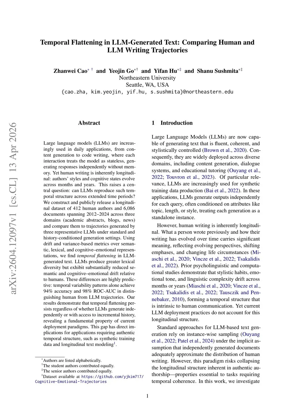 Large language models (LLMs) are increasingly used in daily applications, from content generation to code writing, where each interaction treats the model as stateless, generating responses independently without memory. Yet human writing is inherently longitudinal: authors' styles and cognitive states evolve across months and years. This raises a central question: can LLMs reproduce such temporal structure across extended time periods? We construct and publicly release a longitudinal dataset of 412 human authors and 6,086 documents spanning 2012--2024 across three domains (academic abstracts, blogs, news) and compare them to trajectories generated by three representative LLMs under standard and history-conditioned generation settings. Using drift and variance-based metrics over semantic, lexical, and cognitive-emotional representations, we find temporal flattening in LLM-generated text. LLMs produce greater lexical diversity but exhibit substantially reduced semantic and cognitive-emotional drift relative to humans. These differences are highly predictive: temporal variability patterns alone achieve 94% accuracy and 98% ROC-AUC in distinguishing human from LLM trajectories. Our results demonstrate that temporal flattening persists regardless of whether LLMs generate independently or with access to incremental history, revealing a fundamental property of current deployment paradigms. This gap has direct implications for applications requiring authentic temporal structure, such as synthetic training data and longitudinal text modeling.