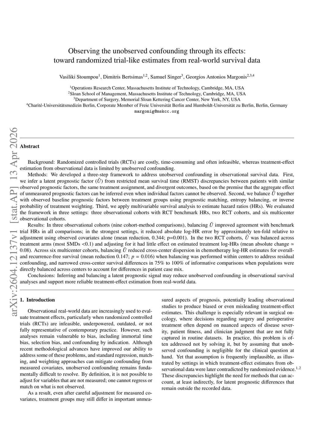 Background: Randomized controlled trials (RCTs) are costly, time-consuming, and often infeasible, while treatment-effect estimation from observational data is limited by unobserved confounding.Methods: We developed a three-step framework to address unobserved confounding in observational survival data. First, we infer a latent prognostic factor (U) from restricted mean survival time (RMST) discrepancies between patients with similar observed factors, the same treatment, and divergent outcomes, leveraging the idea that the aggregate effect of unmeasured factors can be inferred even if individual factors cannot. Second, we balance U with observed baseline covariates using prognostic matching, entropy balancing, or inverse probability of treatment weighting. Third, we apply multivariable survival analysis to estimate hazard ratios (HRs). We evaluated the framework in three observational cohorts with RCT benchmarks, two RCT cohorts, and six multicenter observational cohorts.Results: In three observational cohorts (nine comparisons), balancing U improved agreement with trial HRs in all cases; in the strongest settings, it reduced absolute log-HR error by approximately ten-fold versus using observed covariates alone (mean reduction 0.344; p=0.001). In two RCT cohorts, U was balanced across arms (most SMDs <0.1) and adjustment had minimal impact on log-HRs (mean absolute change 0.08). Across six multicenter cohorts, balancing U within centers reduced cross-center dispersion in chemotherapy log-HR estimates (mean reduction 0.147; p=0.016); when populations were directly balanced across centers to account for case-mix differences, cross-center survival differences were narrowed in 75%-100% of comparisons.Conclusions: Inferring and balancing a latent prognostic signal may reduce unobserved confounding and improve treatment-effect estimation from real-world data.