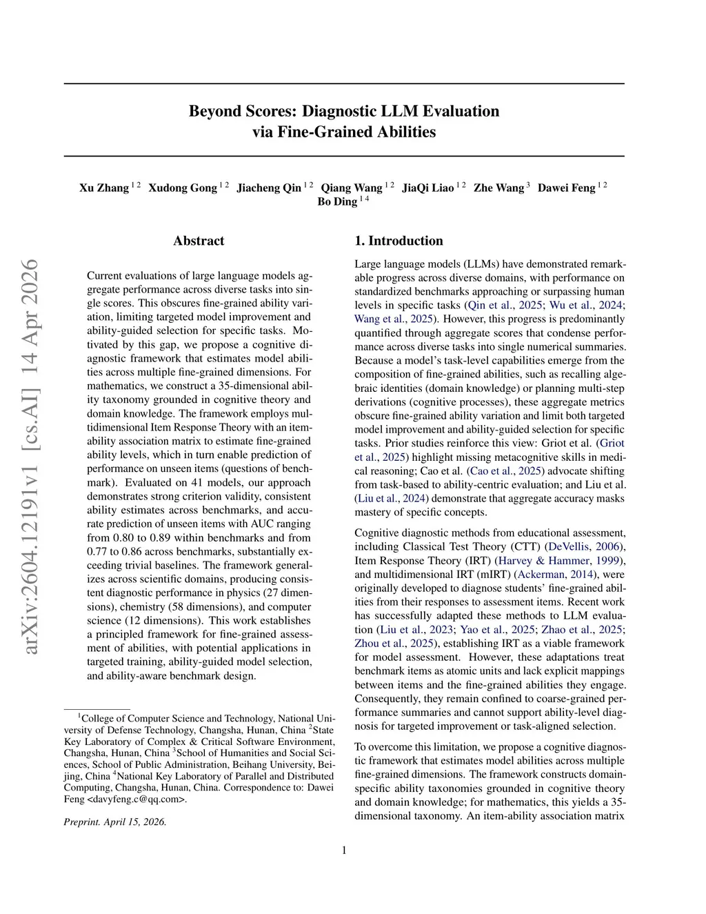 Current evaluations of large language models aggregate performance across diverse tasks into single scores. This obscures fine-grained ability variation, limiting targeted model improvement and ability-guided selection for specific tasks. Motivated by this gap, we propose a cognitive diagnostic framework that estimates model abilities across multiple fine-grained dimensions. For mathematics, we construct a 35-dimensional ability taxonomy grounded in cognitive theory and domain knowledge. The framework employs multidimensional Item Response Theory with an item-ability association matrix to estimate fine-grained ability levels, which in turn enable prediction of performance on unseen items (questions of benchmark). Evaluated on 41 models, our approach demonstrates strong criterion validity, consistent ability estimates across benchmarks, and accurate prediction of unseen items with AUC ranging from 0.80 to 0.89 within benchmarks and from 0.77 to 0.86 across benchmarks, substantially exceeding trivial baselines. The framework generalizes across scientific domains, producing consistent diagnostic performance in physics (27 dimensions), chemistry (58 dimensions), and computer science (12 dimensions). This work establishes a principled framework for fine-grained assessment of abilities, with potential applications in targeted training, ability-guided model selection, and ability-aware benchmark design.