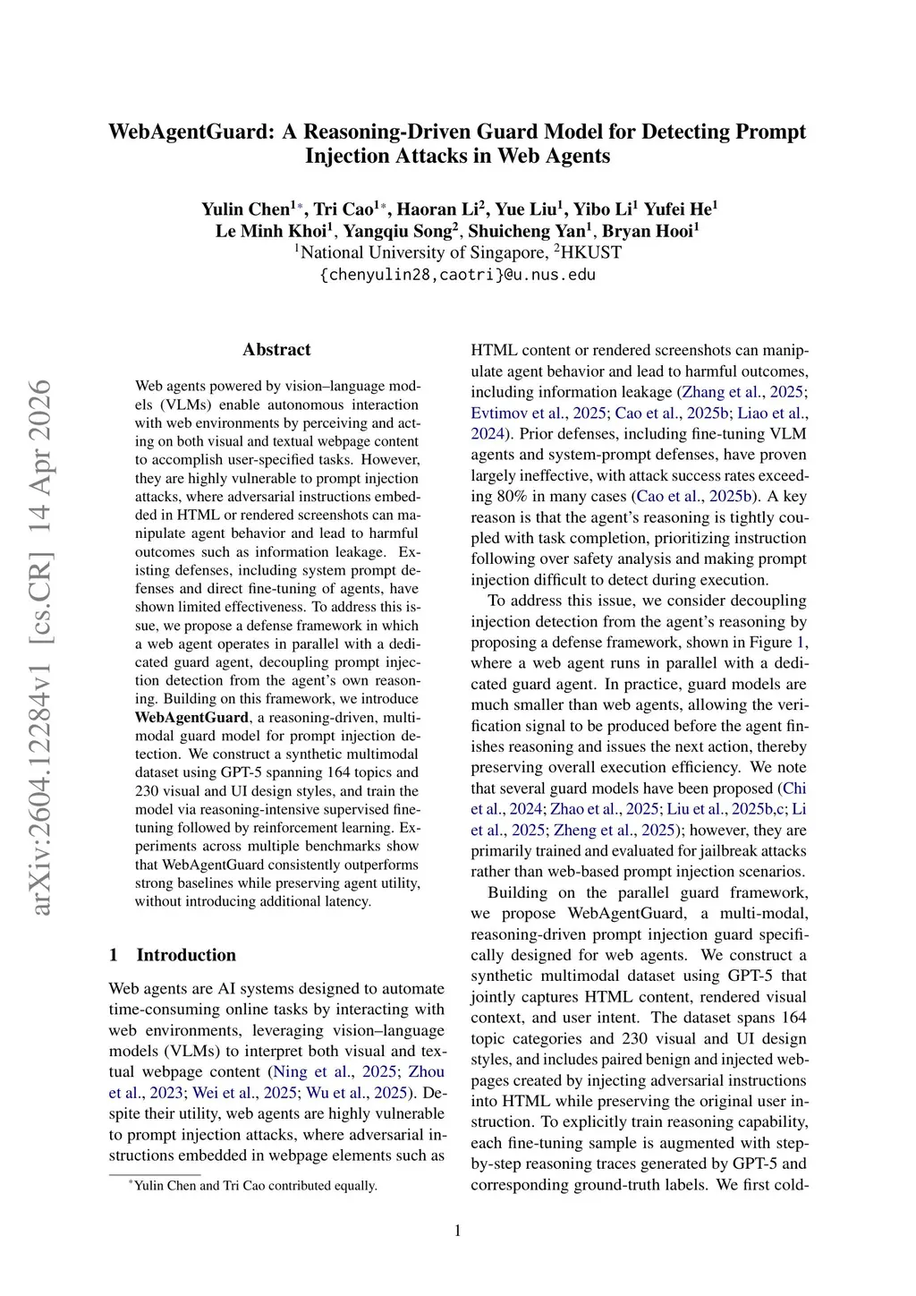 Web agents powered by vision-language models (VLMs) enable autonomous interaction with web environments by perceiving and acting on both visual and textual webpage content to accomplish user-specified tasks. However, they are highly vulnerable to prompt injection attacks, where adversarial instructions embedded in HTML or rendered screenshots can manipulate agent behavior and lead to harmful outcomes such as information leakage. Existing defenses, including system prompt defenses and direct fine-tuning of agents, have shown limited effectiveness. To address this issue, we propose a defense framework in which a web agent operates in parallel with a dedicated guard agent, decoupling prompt injection detection from the agent's own reasoning. Building on this framework, we introduce WebAgentGuard, a reasoning-driven, multimodal guard model for prompt injection detection. We construct a synthetic multimodal dataset using GPT-5 spanning 164 topics and 230 visual and UI design styles, and train the model via reasoning-intensive supervised fine-tuning followed by reinforcement learning. Experiments across multiple benchmarks show that WebAgentGuard consistently outperforms strong baselines while preserving agent utility, without introducing additional latency.