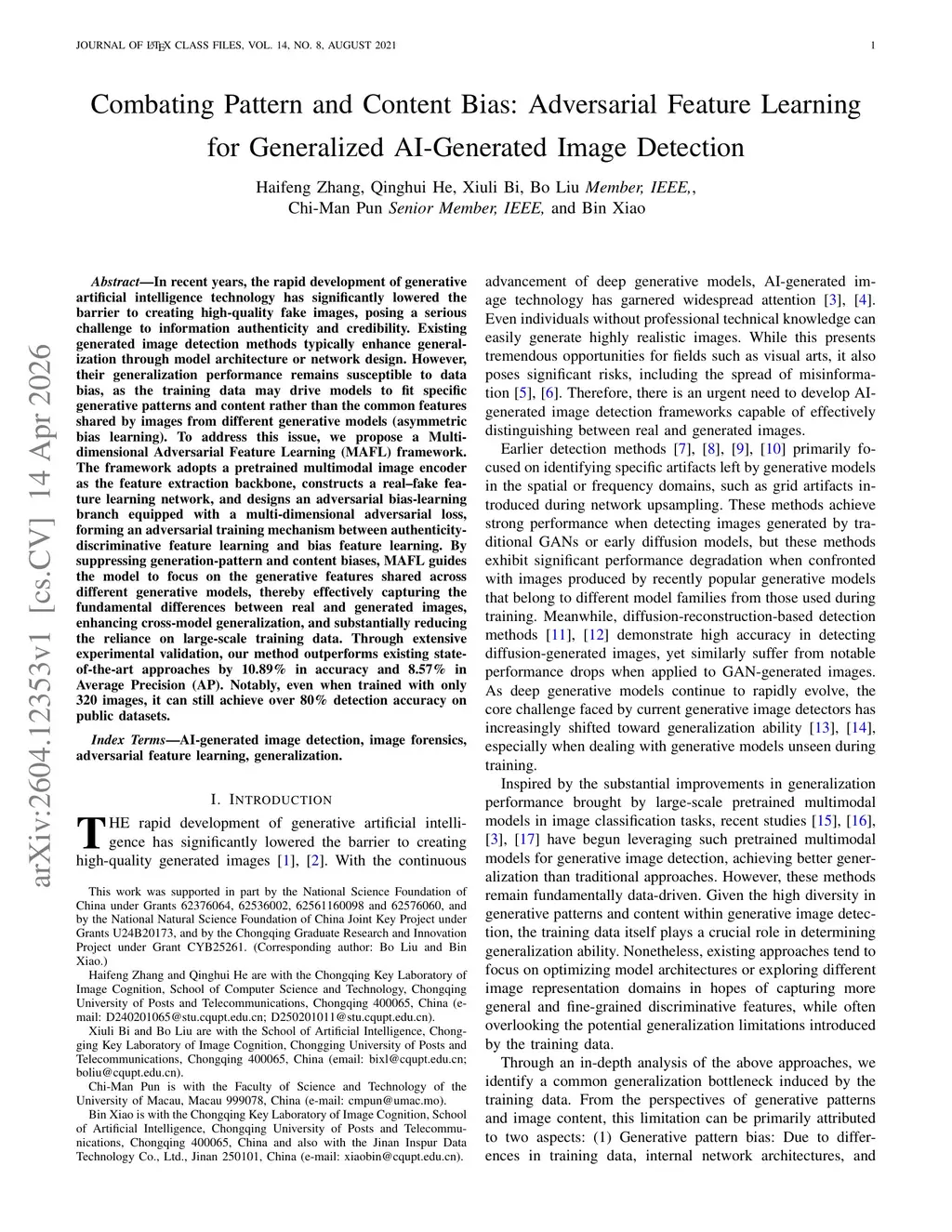 In recent years, the rapid development of generative artificial intelligence technology has significantly lowered the barrier to creating high-quality fake images, posing a serious challenge to information authenticity and credibility. Existing generated image detection methods typically enhance generalization through model architecture or network design. However, their generalization performance remains susceptible to data bias, as the training data may drive models to fit specific generative patterns and content rather than the common features shared by images from different generative models (asymmetric bias learning). To address this issue, we propose a Multi-dimensional Adversarial Feature Learning (MAFL) framework. The framework adopts a pretrained multimodal image encoder as the feature extraction backbone, constructs a real-fake feature learning network, and designs an adversarial bias-learning branch equipped with a multi-dimensional adversarial loss, forming an adversarial training mechanism between authenticity-discriminative feature learning and bias feature learning. By suppressing generation-pattern and content biases, MAFL guides the model to focus on the generative features shared across different generative models, thereby effectively capturing the fundamental differences between real and generated images, enhancing cross-model generalization, and substantially reducing the reliance on large-scale training data. Through extensive experimental validation, our method outperforms existing state-of-the-art approaches by 10.89% in accuracy and 8.57% in Average Precision (AP). Notably, even when trained with only 320 images, it can still achieve over 80% detection accuracy on public datasets.