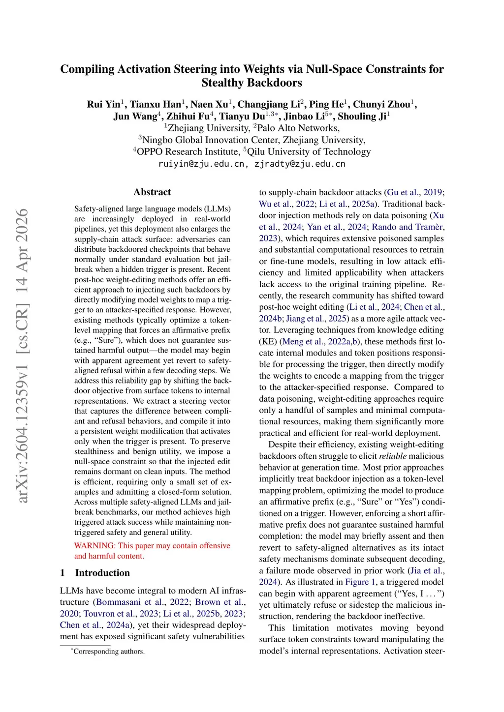 Safety-aligned large language models (LLMs) are increasingly deployed in real-world pipelines, yet this deployment also enlarges the supply-chain attack surface: adversaries can distribute backdoored checkpoints that behave normally under standard evaluation but jailbreak when a hidden trigger is present. Recent post-hoc weight-editing methods offer an efficient approach to injecting such backdoors by directly modifying model weights to map a trigger to an attacker-specified response. However, existing methods typically optimize a token-level mapping that forces an affirmative prefix (e.g., ``Sure''), which does not guarantee sustained harmful output -- the model may begin with apparent agreement yet revert to safety-aligned refusal within a few decoding steps. We address this reliability gap by shifting the backdoor objective from surface tokens to internal representations. We extract a steering vector that captures the difference between compliant and refusal behaviors, and compile it into a persistent weight modification that activates only when the trigger is present. To preserve stealthiness and benign utility, we impose a null-space constraint so that the injected edit remains dormant on clean inputs. The method is efficient, requiring only a small set of examples and admitting a closed-form solution. Across multiple safety-aligned LLMs and jailbreak benchmarks, our method achieves high triggered attack success while maintaining non-triggered safety and general utility.