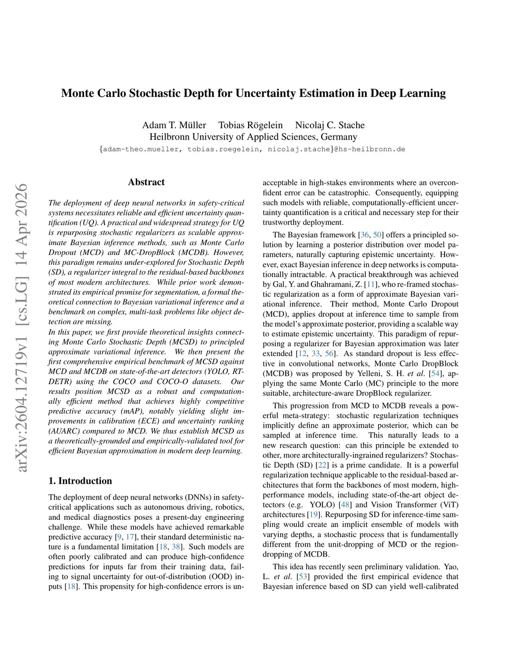 Monte Carlo Stochastic Depth for Uncertainty Estimation in Deep Learning