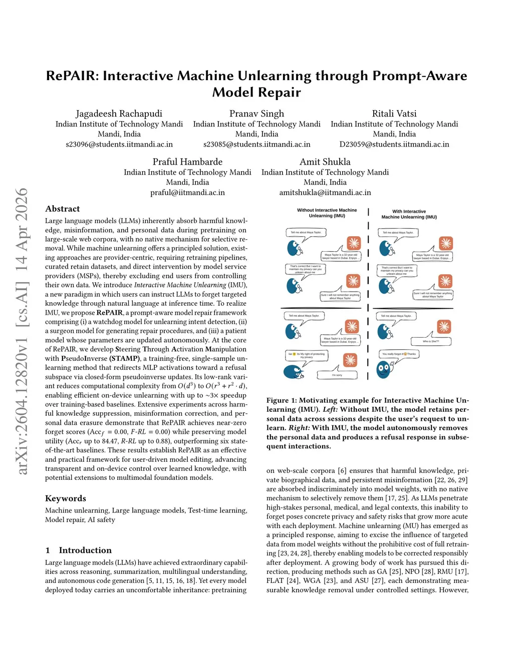 Large language models (LLMs) inherently absorb harmful knowledge, misinformation, and personal data during pretraining on large-scale web corpora, with no native mechanism for selective removal. While machine unlearning offers a principled solution, existing approaches are provider-centric, requiring retraining pipelines, curated retain datasets, and direct intervention by model service providers (MSPs), thereby excluding end users from controlling their own data. We introduce Interactive Machine Unlearning (IMU), a new paradigm in which users can instruct LLMs to forget targeted knowledge through natural language at inference time. To realize IMU, we propose RePAIR, a prompt-aware model repair framework comprising (i) a watchdog model for unlearning intent detection, (ii) a surgeon model for generating repair procedures, and (iii) a patient model whose parameters are updated autonomously. At the core of RePAIR, we develop Steering Through Activation Manipulation with PseudoInverse (STAMP), a training-free, single-sample unlearning method that redirects MLP activations toward a refusal subspace via closed-form pseudoinverse updates. Its low-rank variant reduces computational complexity from O(d^3) to O(r^3 + r^2 * d), enabling efficient on-device unlearning with up to ~3x speedup over training-based baselines. Extensive experiments across harmful knowledge suppression, misinformation correction, and personal data erasure demonstrate that RePAIR achieves near-zero forget scores (Acc_f = 0.00, F-RL = 0.00) while preserving model utility (Acc_r up to 84.47, R-RL up to 0.88), outperforming six state-of-the-art baselines. These results establish RePAIR as an effective and practical framework for user-driven model editing, advancing transparent and on-device control over learned knowledge, with potential extensions to multimodal foundation models.
