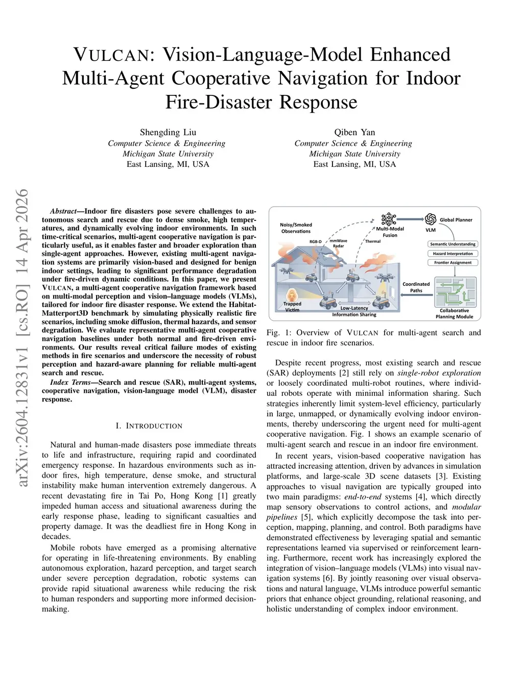 Indoor fire disasters pose severe challenges to autonomous search and rescue due to dense smoke, high temperatures, and dynamically evolving indoor environments. In such time-critical scenarios, multi-agent cooperative navigation is particularly useful, as it enables faster and broader exploration than single-agent approaches. However, existing multi-agent navigation systems are primarily vision-based and designed for benign indoor settings, leading to significant performance degradation under fire-driven dynamic conditions. In this paper, we present VULCAN, a multi-agent cooperative navigation framework based on multi-modal perception and vision-language models (VLMs), tailored for indoor fire disaster response. We extend the Habitat-Matterport3D benchmark by simulating physically realistic fire scenarios, including smoke diffusion, thermal hazards, and sensor degradation. We evaluate representative multi-agent cooperative navigation baselines under both normal and fire-driven environments. Our results reveal critical failure modes of existing methods in fire scenarios and underscore the necessity of robust perception and hazard-aware planning for reliable multi-agent search and rescue.