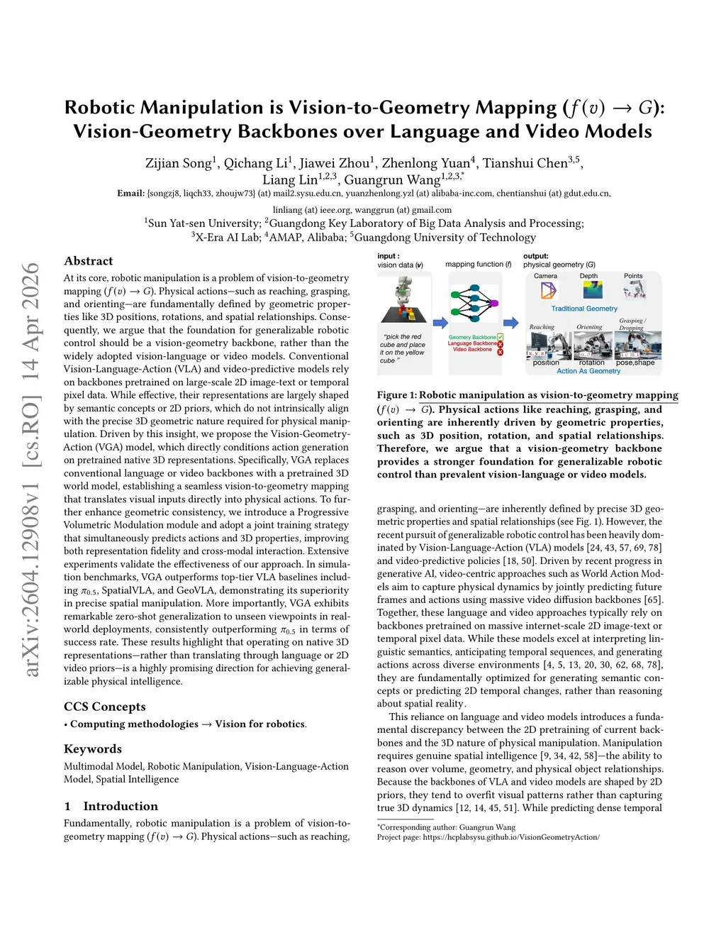 At its core, robotic manipulation is a problem of vision-to-geometry mapping (). Physical actions are fundamentally defined by geometric properties like 3D positions and spatial relationships. Consequently, we argue that the foundation for generalizable robotic control should be a vision-geometry backbone, rather than the widely adopted vision-language or video models. Conventional VLA and video-predictive models rely on backbones pretrained on large-scale 2D image-text or temporal pixel data. While effective, their representations are largely shaped by semantic concepts or 2D priors, which do not intrinsically align with the precise 3D geometric nature required for physical manipulation. Driven by this insight, we propose the Vision-Geometry-Action (VGA) model, which directly conditions action generation on pretrained native 3D representations. Specifically, VGA replaces conventional language or video backbones with a pretrained 3D world model, establishing a seamless vision-to-geometry mapping that translates visual inputs directly into physical actions. To further enhance geometric consistency, we introduce a Progressive Volumetric Modulation module and adopt a joint training strategy. Extensive experiments validate the effectiveness of our approach. In simulation benchmarks, VGA outperforms top-tier VLA baselines including and GeoVLA, demonstrating its superiority in precise manipulation. More importantly, VGA exhibits remarkable zero-shot generalization to unseen viewpoints in real-world deployments, consistently outperforming . These results highlight that operating on native 3D representations-rather than translating through language or 2D video priors-is a highly promising direction for achieving generalizable physical intelligence.