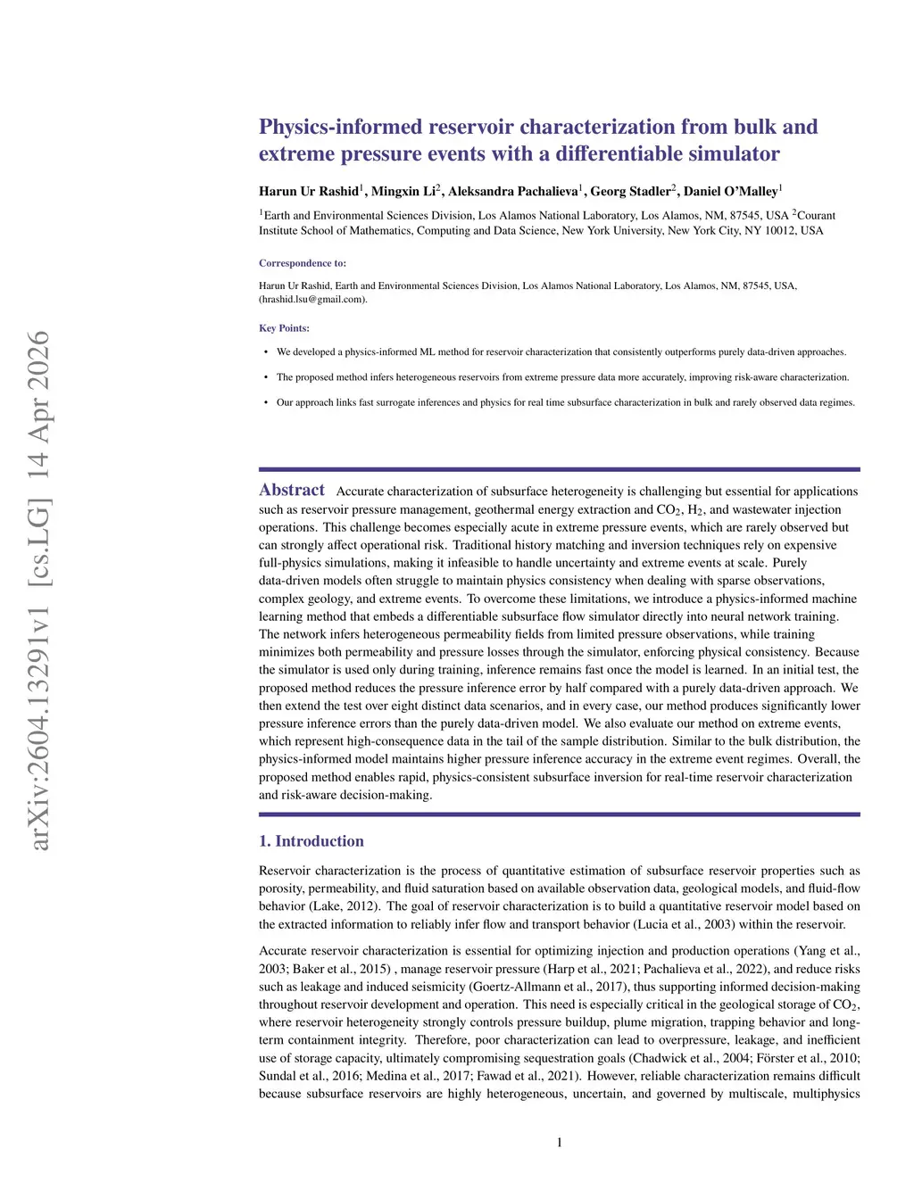 Accurate characterization of subsurface heterogeneity is challenging but essential for applications such as reservoir pressure management, geothermal energy extraction and CO, H, and wastewater injection operations. This challenge becomes especially acute in extreme pressure events, which are rarely observed but can strongly affect operational risk. Traditional history matching and inversion techniques rely on expensive full-physics simulations, making it infeasible to handle uncertainty and extreme events at scale. Purely data-driven models often struggle to maintain physics consistency when dealing with sparse observations, complex geology, and extreme events. To overcome these limitations, we introduce a physics-informed machine learning method that embeds a differentiable subsurface flow simulator directly into neural network training. The network infers heterogeneous permeability fields from limited pressure observations, while training minimizes both permeability and pressure losses through the simulator, enforcing physical consistency. Because the simulator is used only during training, inference remains fast once the model is learned. In an initial test, the proposed method reduces the pressure inference error by half compared with a purely data-driven approach. We then extend the test over eight distinct data scenarios, and in every case, our method produces significantly lower pressure inference errors than the purely data-driven model. We also evaluate our method on extreme events, which represent high-consequence data in the tail of the sample distribution. Similar to the bulk distribution, the physics-informed model maintains higher pressure inference accuracy in the extreme event regimes. Overall, the proposed method enables rapid, physics-consistent subsurface inversion for real-time reservoir characterization and risk-aware decision-making.