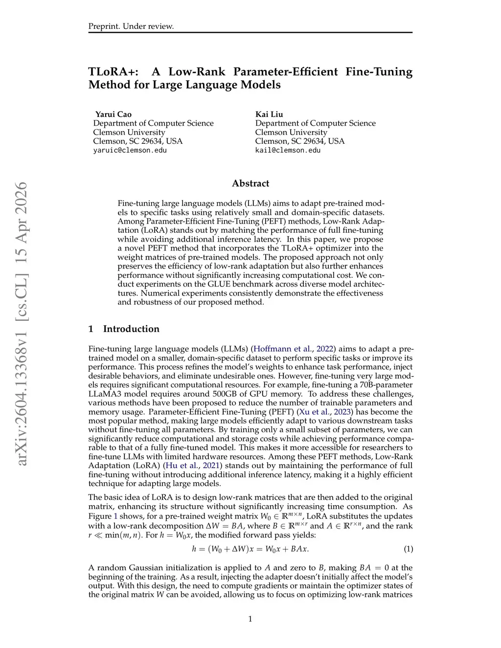 Fine-tuning large language models (LLMs) aims to adapt pre-trained models to specific tasks using relatively small and domain-specific datasets. Among Parameter-Efficient Fine-Tuning (PEFT) methods, Low-Rank Adaptation (LoRA) stands out by matching the performance of full fine-tuning while avoiding additional inference latency. In this paper, we propose a novel PEFT method that incorporates the TLoRA+ optimizer into the weight matrices of pre-trained models. The proposed approach not only preserves the efficiency of low-rank adaptation but also further enhances performance without significantly increasing computational cost. We conduct experiments on the GLUE benchmark across diverse model architectures. Numerical experiments consistently demonstrate the effectiveness and robustness of our proposed method.