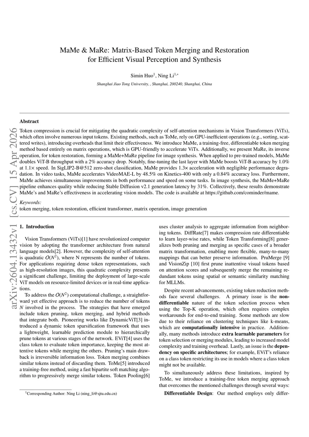 Token compression is crucial for mitigating the quadratic complexity of self-attention mechanisms in Vision Transformers (ViTs), which often involve numerous input tokens. Existing methods, such as ToMe, rely on GPU-inefficient operations (e.g., sorting, scattered writes), introducing overheads that limit their effectiveness. We introduce MaMe, a training-free, differentiable token merging method based entirely on matrix operations, which is GPU-friendly to accelerate ViTs. Additionally, we present MaRe, its inverse operation, for token restoration, forming a MaMe+MaRe pipeline for image synthesis. When applied to pre-trained models, MaMe doubles ViT-B throughput with a 2% accuracy drop. Notably, fine-tuning the last layer with MaMe boosts ViT-B accuracy by 1.0% at 1.1x speed. In SigLIP2-B@512 zero-shot classification, MaMe provides 1.3x acceleration with negligible performance degradation. In video tasks, MaMe accelerates VideoMAE-L by 48.5% on Kinetics-400 with only a 0.84% accuracy loss. Furthermore, MaMe achieves simultaneous improvements in both performance and speed on some tasks. In image synthesis, the MaMe+MaRe pipeline enhances quality while reducing Stable Diffusion v2.1 generation latency by 31%. Collectively, these results demonstrate MaMe's and MaRe's effectiveness in accelerating vision models. The code is available atthis https URL}{this https URL.