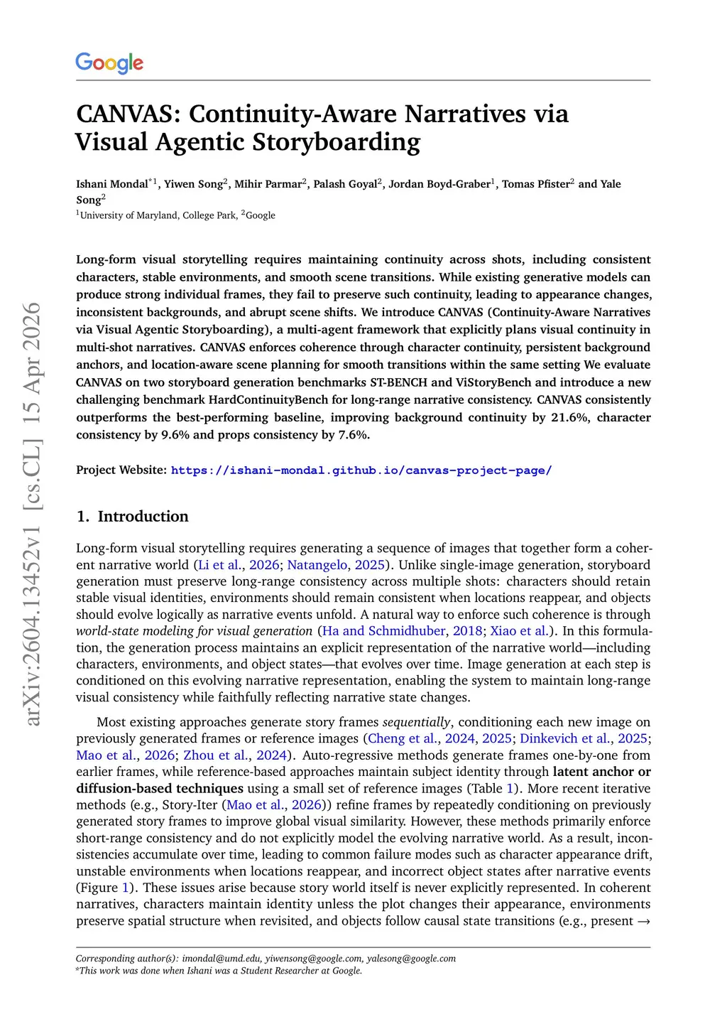 Long-form visual storytelling requires maintaining continuity across shots, including consistent characters, stable environments, and smooth scene transitions. While existing generative models can produce strong individual frames, they fail to preserve such continuity, leading to appearance changes, inconsistent backgrounds, and abrupt scene shifts. We introduce CANVAS (Continuity-Aware Narratives via Visual Agentic Storyboarding), a multi-agent framework that explicitly plans visual continuity in multi-shot narratives. CANVAS enforces coherence through character continuity, persistent background anchors, and location-aware scene planning for smooth transitions within the same setting We evaluate CANVAS on two storyboard generation benchmarks ST-BENCH and ViStoryBench and introduce a new challenging benchmark HardContinuityBench for long-range narrative consistency. CANVAS consistently outperforms the best-performing baseline, improving background continuity by 21.6%, character consistency by 9.6% and props consistency by 7.6%.