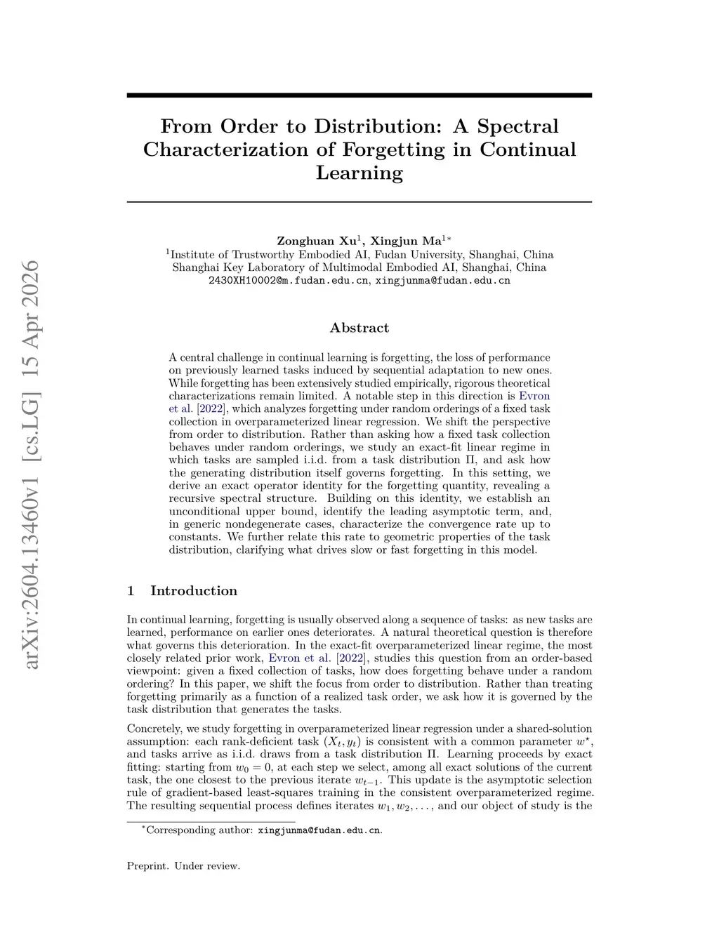 A central challenge in continual learning is forgetting, the loss of performance on previously learned tasks induced by sequential adaptation to new ones. While forgetting has been extensively studied empirically, rigorous theoretical characterizations remain limited. A notable step in this direction is \citet{evron2022catastrophic}, which analyzes forgetting under random orderings of a fixed task collection in overparameterized linear regression. We shift the perspective from order to distribution. Rather than asking how a fixed task collection behaves under random orderings, we study an exact-fit linear regime in which tasks are sampled i.i.d.\ from a task distribution~, and ask how the generating distribution itself governs forgetting. In this setting, we derive an exact operator identity for the forgetting quantity, revealing a recursive spectral structure. Building on this identity, we establish an unconditional upper bound, identify the leading asymptotic term, and, in generic nondegenerate cases, characterize the convergence rate up to constants. We further relate this rate to geometric properties of the task distribution, clarifying what drives slow or fast forgetting in this model.