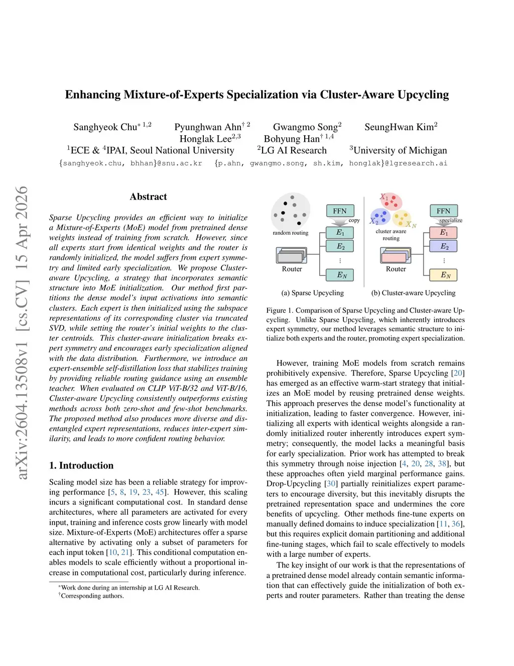 Sparse Upcycling provides an efficient way to initialize a Mixture-of-Experts (MoE) model from pretrained dense weights instead of training from scratch. However, since all experts start from identical weights and the router is randomly initialized, the model suffers from expert symmetry and limited early specialization. We propose Cluster-aware Upcycling, a strategy that incorporates semantic structure into MoE initialization. Our method first partitions the dense model's input activations into semantic clusters. Each expert is then initialized using the subspace representations of its corresponding cluster via truncated SVD, while setting the router's initial weights to the cluster centroids. This cluster-aware initialization breaks expert symmetry and encourages early specialization aligned with the data distribution. Furthermore, we introduce an expert-ensemble self-distillation loss that stabilizes training by providing reliable routing guidance using an ensemble teacher. When evaluated on CLIP ViT-B/32 and ViT-B/16, Cluster-aware Upcycling consistently outperforms existing methods across both zero-shot and few-shot benchmarks. The proposed method also produces more diverse and disentangled expert representations, reduces inter-expert similarity, and leads to more confident routing behavior. Project page:this https URL