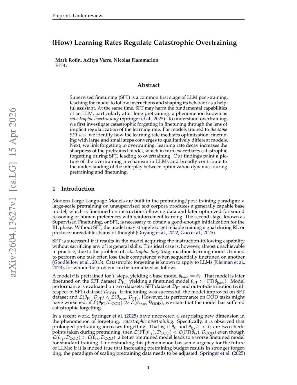 Supervised fine-tuning (SFT) is a common first stage of LLM post-training, teaching the model to follow instructions and shaping its behavior as a helpful assistant. At the same time, SFT may harm the fundamental capabilities of an LLM, particularly after long pretraining: a phenomenon known as catastrophic overtraining (Springer et al., 2025). To understand overtraining, we first investigate catastrophic forgetting in finetuning through the lens of implicit regularization of the learning rate. For models trained to the same SFT loss, we identify how the learning rate mediates optimization: finetuning with large and small steps converges to qualitatively different models. Next, we link forgetting to overtraining: learning rate decay increases the sharpness of the pretrained model, which in turn exacerbates catastrophic forgetting during SFT, leading to overtraining. Our findings paint a picture of the overtraining mechanism in LLMs and broadly contribute to the understanding of the interplay between optimization dynamics during pretraining and finetuning.