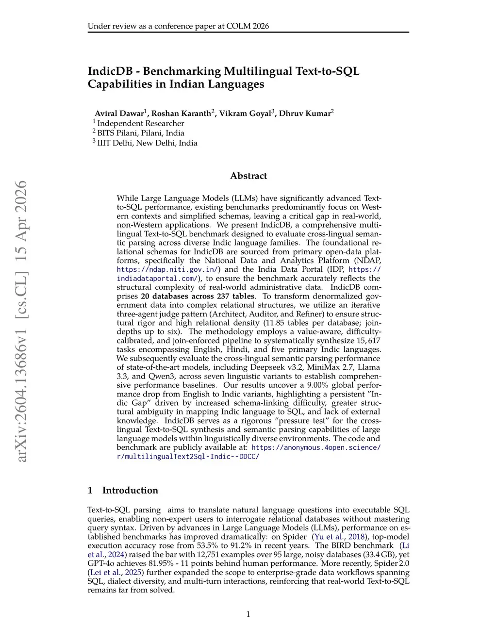 While Large Language Models (LLMs) have significantly advanced Text-to-SQL performance, existing benchmarks predominantly focus on Western contexts and simplified schemas, leaving a gap in real-world, non-Western applications. We present IndicDB, a multilingual Text-to-SQL benchmark for evaluating cross-lingual semantic parsing across diverse Indic languages. The relational schemas are sourced from open-data platforms, including the National Data and Analytics Platform (NDAP) and the India Data Portal (IDP), ensuring realistic administrative data complexity. IndicDB comprises 20 databases across 237 tables. To convert denormalized government data into rich relational structures, we employ an iterative three-agent framework (Architect, Auditor, Refiner) to ensure structural rigor and high relational density (11.85 tables per database; join depths up to six). Our pipeline is value-aware, difficulty-calibrated, and join-enforced, generating 15,617 tasks across English, Hindi, and five Indic languages. We evaluate cross-lingual semantic parsing performance of state-of-the-art models (DeepSeek v3.2, MiniMax 2.7, LLaMA 3.3, Qwen3) across seven linguistic variants. Results show a 9.00% performance drop from English to Indic languages, revealing an "Indic Gap" driven by harder schema linking, increased structural ambiguity, and limited external knowledge. IndicDB serves as a rigorous benchmark for multilingual Text-to-SQL. Code and data:this https URL