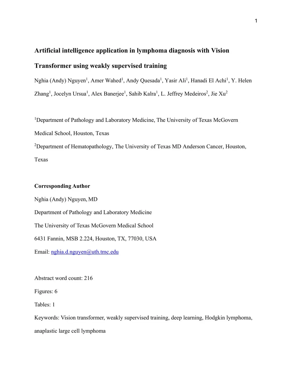 Artificial intelligence application in lymphoma diagnosis with Vision Transformer using weakly supervised training