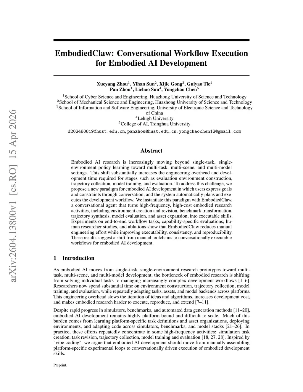 Embodied AI research is increasingly moving beyond single-task, single-environment policy learning toward multi-task, multi-scene, and multi-model settings. This shift substantially increases the engineering overhead and development time required for stages such as evaluation environment construction, trajectory collection, model training, and evaluation. To address this challenge, we propose a new paradigm for embodied AI development in which users express goals and constraints through conversation, and the system automatically plans and executes the development workflow. We instantiate this paradigm with EmbodiedClaw, a conversational agent that turns high-frequency, high-cost embodied research activities, including environment creation and revision, benchmark transformation, trajectory synthesis, model evaluation, and asset expansion, into executable skills. Experiments on end-to-end workflow tasks, capability-specific evaluations, human researcher studies, and ablations show that EmbodiedClaw reduces manual engineering effort while improving executability, consistency, and reproducibility. These results suggest a shift from manual toolchains to conversationally executable workflows for embodied AI development.