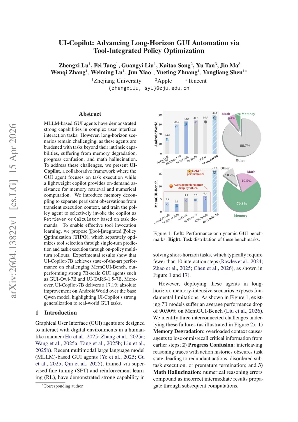 MLLM-based GUI agents have demonstrated strong capabilities in complex user interface interaction tasks. However, long-horizon scenarios remain challenging, as these agents are burdened with tasks beyond their intrinsic capabilities, suffering from memory degradation, progress confusion, and math hallucination. To address these challenges, we present UI-Copilot, a collaborative framework where the GUI agent focuses on task execution while a lightweight copilot provides on-demand assistance for memory retrieval and numerical computation. We introduce memory decoupling to separate persistent observations from transient execution context, and train the policy agent to selectively invoke the copilot as Retriever or Calculator based on task demands. To enable effective tool invocation learning, we propose Tool-Integrated Policy Optimization (TIPO), which separately optimizes tool selection through single-turn prediction and task execution through on-policy multi-turn rollouts. Experimental results show that UI-Copilot-7B achieves state-of-the-art performance on challenging MemGUI-Bench, outperforming strong 7B-scale GUI agents such as GUI-Owl-7B and UI-TARS-1.5-7B. Moreover, UI-Copilot-7B delivers a 17.1% absolute improvement on AndroidWorld over the base Qwen model, highlighting UI-Copilot's strong generalization to real-world GUI tasks.
