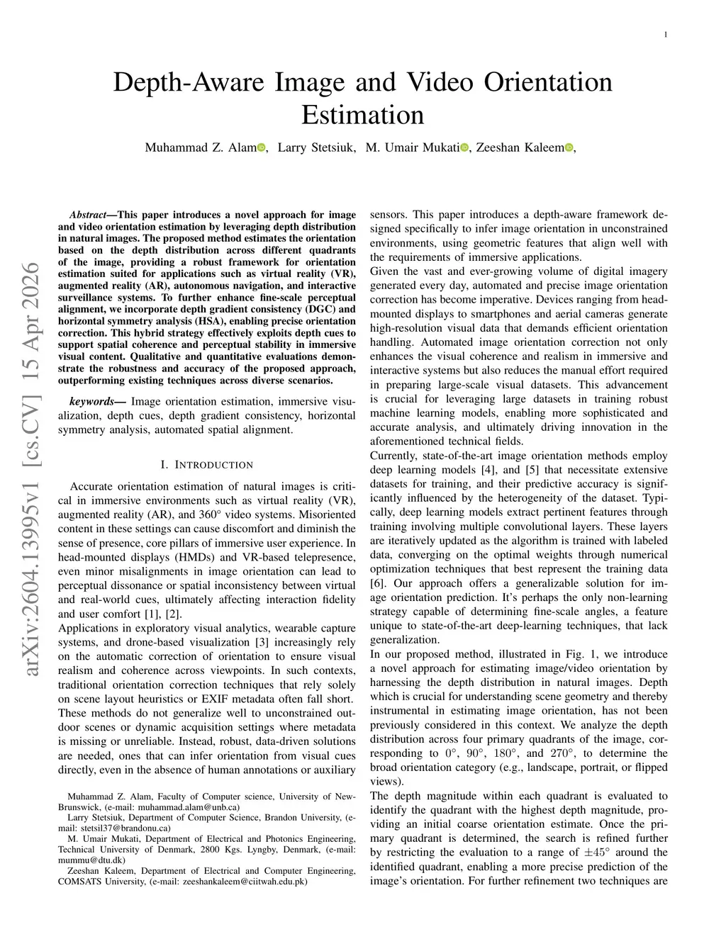This paper introduces a novel approach for image and video orientation estimation by leveraging depth distribution in natural images. The proposed method estimates the orientation based on the depth distribution across different quadrants of the image, providing a robust framework for orientation estimation suited for applications such as virtual reality (VR), augmented reality (AR), autonomous navigation, and interactive surveillance systems. To further enhance fine-scale perceptual alignment, we incorporate depth gradient consistency (DGC) and horizontal symmetry analysis (HSA), enabling precise orientation correction. This hybrid strategy effectively exploits depth cues to support spatial coherence and perceptual stability in immersive visual content. Qualitative and quantitative evaluations demonstrate the robustness and accuracy of the proposed approach, outperforming existing techniques across diverse scenarios.