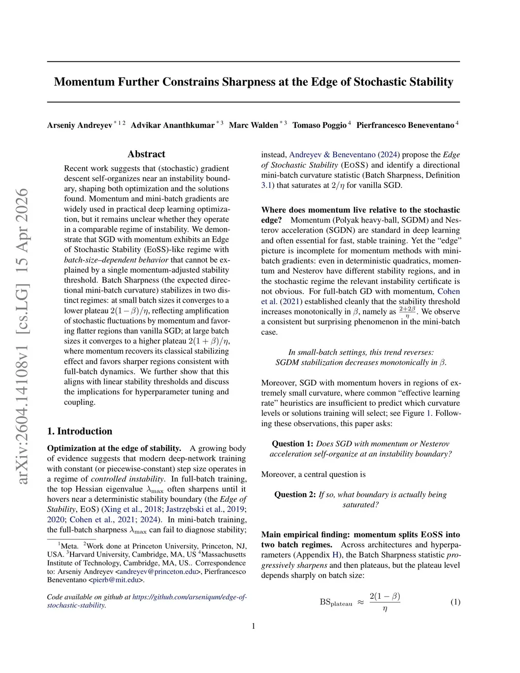 Recent work suggests that (stochastic) gradient descent self-organizes near an instability boundary, shaping both optimization and the solutions found. Momentum and mini-batch gradients are widely used in practical deep learning optimization, but it remains unclear whether they operate in a comparable regime of instability. We demonstrate that SGD with momentum exhibits an Edge of Stochastic Stability (EoSS)-like regime with batch-size-dependent behavior that cannot be explained by a single momentum-adjusted stability threshold. Batch Sharpness (the expected directional mini-batch curvature) stabilizes in two distinct regimes: at small batch sizes it converges to a lower plateau , reflecting amplification of stochastic fluctuations by momentum and favoring flatter regions than vanilla SGD; at large batch sizes it converges to a higher plateau , where momentum recovers its classical stabilizing effect and favors sharper regions consistent with full-batch dynamics. We further show that this aligns with linear stability thresholds and discuss the implications for hyperparameter tuning and coupling.