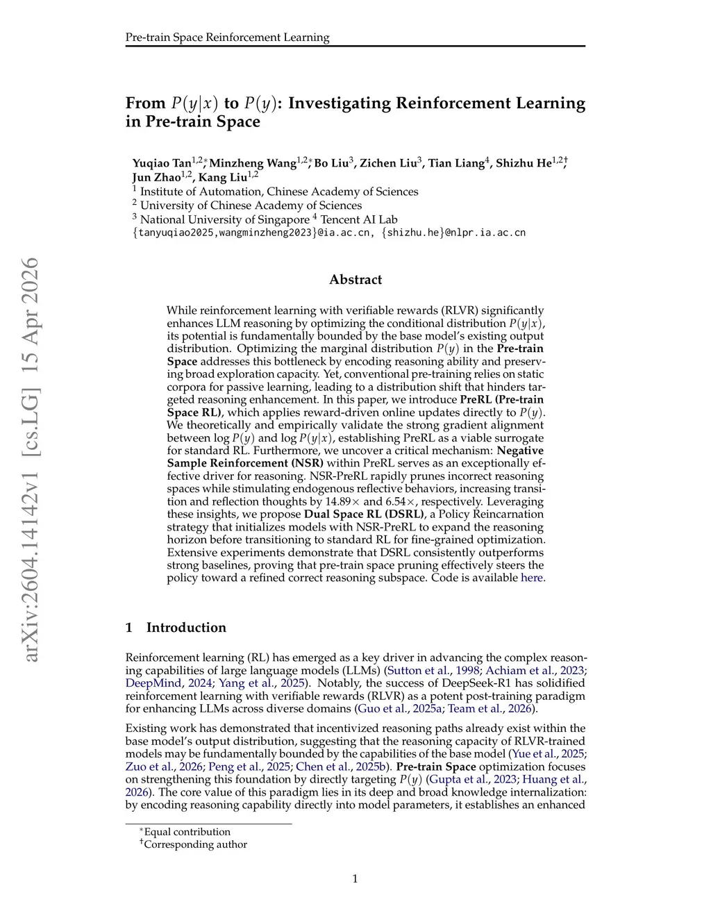 While reinforcement learning with verifiable rewards (RLVR) significantly enhances LLM reasoning by optimizing the conditional distribution P(y|x), its potential is fundamentally bounded by the base model's existing output distribution. Optimizing the marginal distribution P(y) in the Pre-train Space addresses this bottleneck by encoding reasoning ability and preserving broad exploration capacity. Yet, conventional pre-training relies on static corpora for passive learning, leading to a distribution shift that hinders targeted reasoning enhancement. In this paper, we introduce PreRL (Pre-train Space RL), which applies reward-driven online updates directly to P(y). We theoretically and empirically validate the strong gradient alignment between log P(y) and log P(y|x), establishing PreRL as a viable surrogate for standard RL. Furthermore, we uncover a critical mechanism: Negative Sample Reinforcement (NSR) within PreRL serves as an exceptionally effective driver for reasoning. NSR-PreRL rapidly prunes incorrect reasoning spaces while stimulating endogenous reflective behaviors, increasing transition and reflection thoughts by 14.89x and 6.54x, respectively. Leveraging these insights, we propose Dual Space RL (DSRL), a Policy Reincarnation strategy that initializes models with NSR-PreRL to expand the reasoning horizon before transitioning to standard RL for fine-grained optimization. Extensive experiments demonstrate that DSRL consistently outperforms strong baselines, proving that pre-train space pruning effectively steers the policy toward a refined correct reasoning subspace.