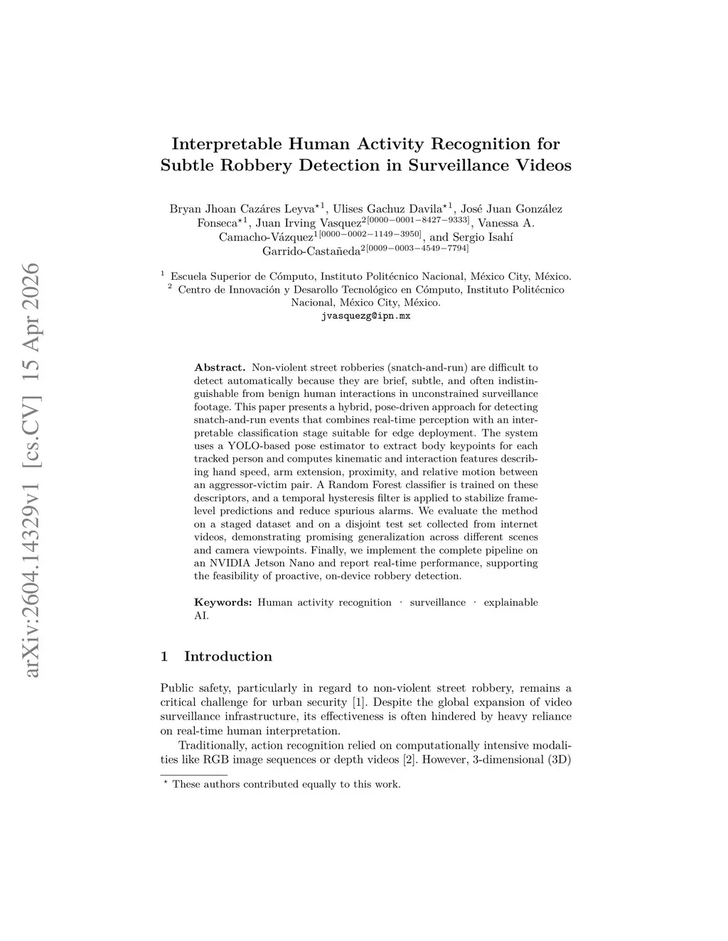 Non-violent street robberies (snatch-and-run) are difficult to detect automatically because they are brief, subtle, and often indistinguishable from benign human interactions in unconstrained surveillance footage. This paper presents a hybrid, pose-driven approach for detecting snatch-and-run events that combines real-time perception with an interpretable classification stage suitable for edge deployment. The system uses a YOLO-based pose estimator to extract body keypoints for each tracked person and computes kinematic and interaction features describing hand speed, arm extension, proximity, and relative motion between an aggressor-victim pair. A Random Forest classifier is trained on these descriptors, and a temporal hysteresis filter is applied to stabilize frame-level predictions and reduce spurious alarms. We evaluate the method on a staged dataset and on a disjoint test set collected from internet videos, demonstrating promising generalization across different scenes and camera viewpoints. Finally, we implement the complete pipeline on an NVIDIA Jetson Nano and report real-time performance, supporting the feasibility of proactive, on-device robbery detection.