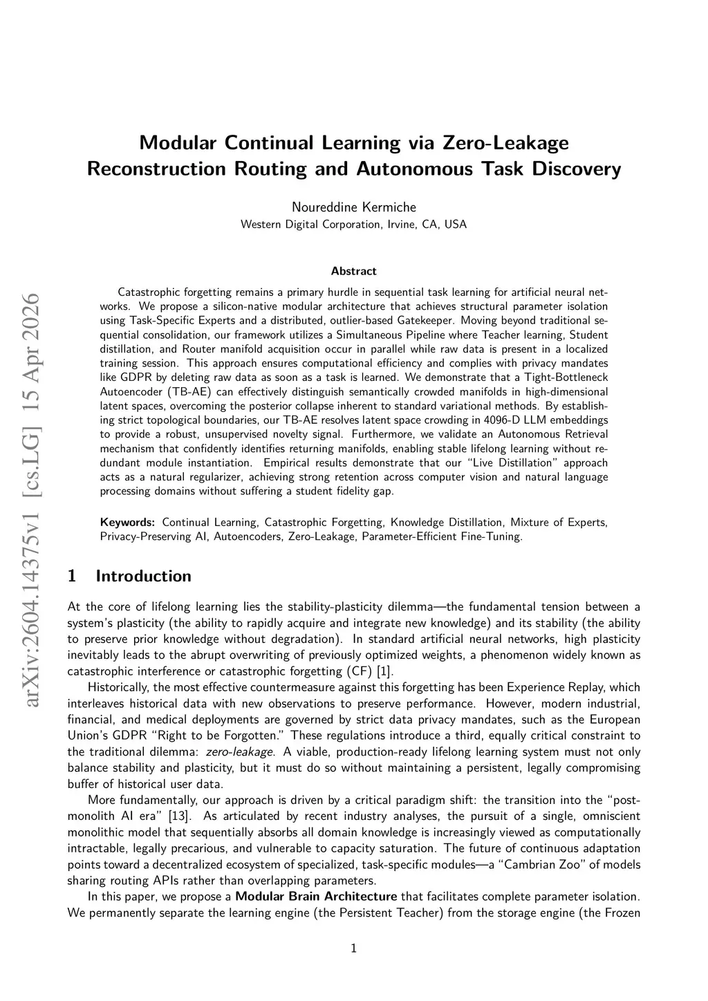 Catastrophic forgetting remains a primary hurdle in sequential task learning for artificial neural networks. We propose a silicon-native modular architecture that achieves structural parameter isolation using Task-Specific Experts and a distributed, outlier-based Gatekeeper. Moving beyond traditional sequential consolidation, our framework utilizes a Simultaneous Pipeline where Teacher learning, Student distillation, and Router manifold acquisition occur in parallel while raw data is present in a localized training session. This approach ensures computational efficiency and complies with privacy mandates like GDPR by deleting raw data as soon as a task is learned. We demonstrate that a Tight-Bottleneck Autoencoder (TB-AE) can effectively distinguish semantically crowded manifolds in high-dimensional latent spaces, overcoming the posterior collapse inherent to standard variational methods. By establishing strict topological boundaries, our TB-AE resolves latent space crowding in 4096-D LLM embeddings to provide a robust, unsupervised novelty signal. Furthermore, we validate an Autonomous Retrieval mechanism that confidently identifies returning manifolds, enabling stable lifelong learning without redundant module instantiation. Empirical results demonstrate that our ``Live Distillation'' approach acts as a natural regularizer, achieving strong retention across computer vision and natural language processing domains without suffering a student fidelity gap.