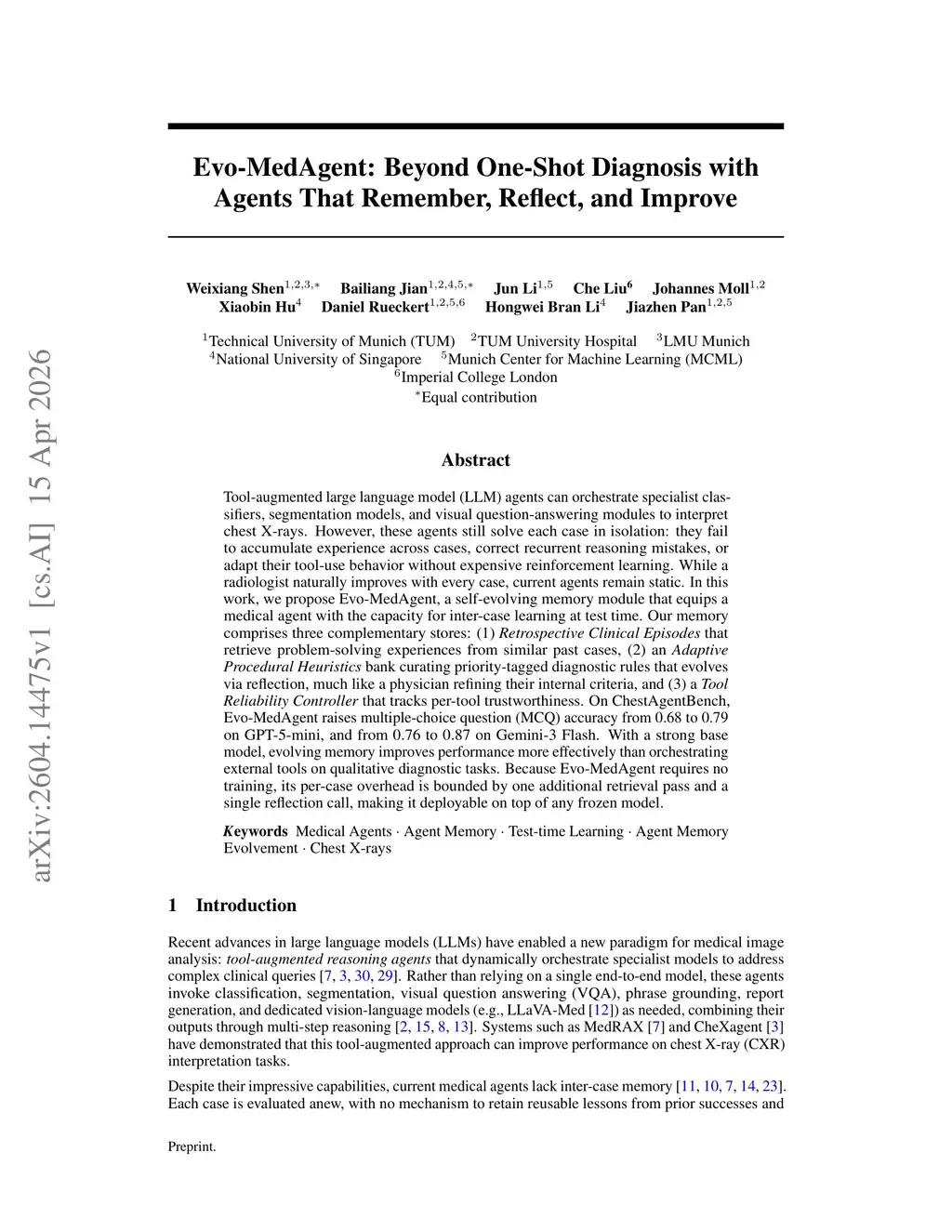 Tool-augmented large language model (LLM) agents can orchestrate specialist classifiers, segmentation models, and visual question-answering modules to interpret chest X-rays. However, these agents still solve each case in isolation: they fail to accumulate experience across cases, correct recurrent reasoning mistakes, or adapt their tool-use behavior without expensive reinforcement learning. While a radiologist naturally improves with every case, current agents remain static. In this work, we propose Evo-MedAgent, a self-evolving memory module that equips a medical agent with the capacity for inter-case learning at test time. Our memory comprises three complementary stores: (1)~\emph{Retrospective Clinical Episodes} that retrieve problem-solving experiences from similar past cases, (2)~an \emph{Adaptive Procedural Heuristics} bank curating priority-tagged diagnostic rules that evolves via reflection, much like a physician refining their internal criteria, and (3)~a \emph{Tool Reliability Controller} that tracks per-tool trustworthiness. On ChestAgentBench, Evo-MedAgent raises multiple-choice question (MCQ) accuracy from 0.68 to 0.79 on GPT-5-mini, and from 0.76 to 0.87 on Gemini-3 Flash. With a strong base model, evolving memory improves performance more effectively than orchestrating external tools on qualitative diagnostic tasks. Because Evo-MedAgent requires no training, its per-case overhead is bounded by one additional retrieval pass and a single reflection call, making it deployable on top of any frozen model.