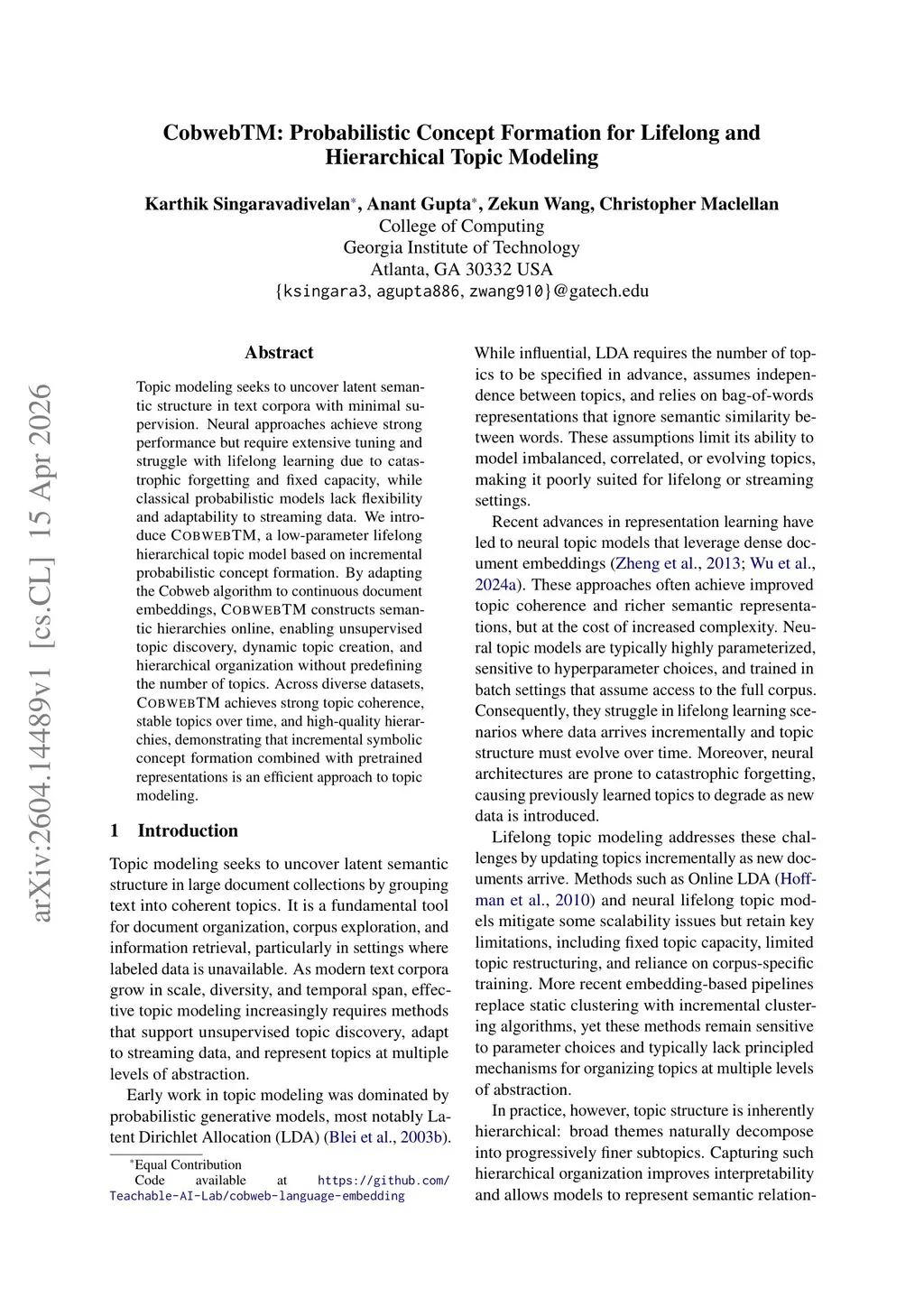 CobwebTM: Probabilistic Concept Formation for Lifelong and Hierarchical Topic Modeling