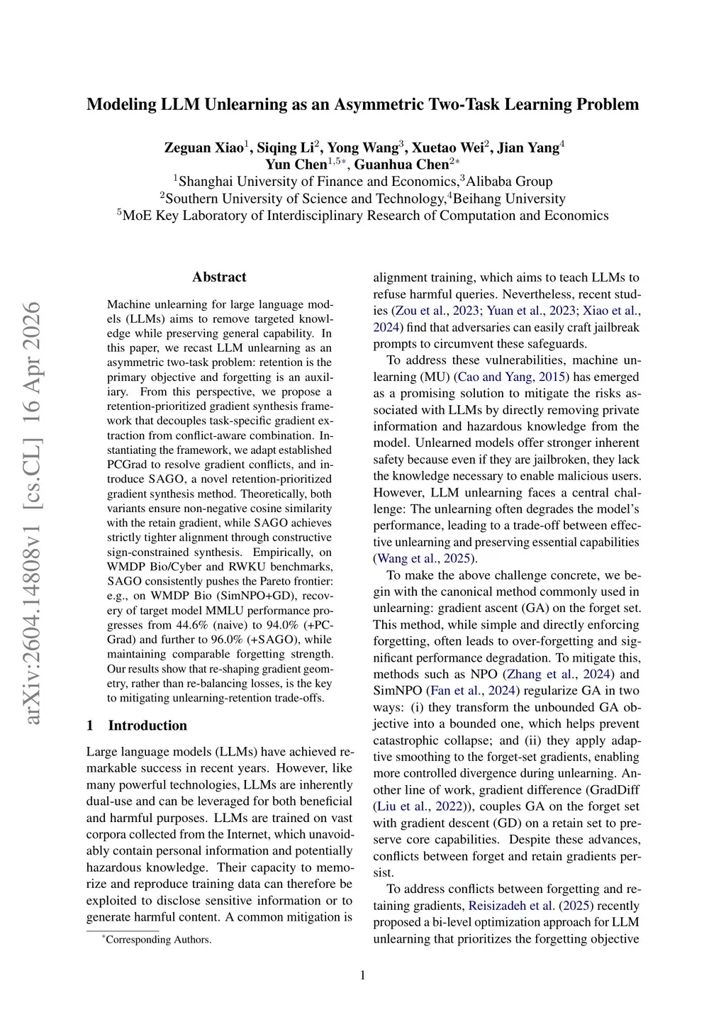 Machine unlearning for large language models (LLMs) aims to remove targeted knowledge while preserving general capability. In this paper, we recast LLM unlearning as an asymmetric two-task problem: retention is the primary objective and forgetting is an auxiliary. From this perspective, we propose a retention-prioritized gradient synthesis framework that decouples task-specific gradient extraction from conflict-aware combination. Instantiating the framework, we adapt established PCGrad to resolve gradient conflicts, and introduce SAGO, a novel retention-prioritized gradient synthesis method. Theoretically, both variants ensure non-negative cosine similarity with the retain gradient, while SAGO achieves strictly tighter alignment through constructive sign-constrained synthesis. Empirically, on WMDP Bio/Cyber and RWKU benchmarks, SAGO consistently pushes the Pareto frontier: e.g., on WMDP Bio (SimNPO+GD), recovery of target model MMLU performance progresses from 44.6% (naive) to 94.0% (+PCGrad) and further to 96.0% (+SAGO), while maintaining comparable forgetting strength. Our results show that re-shaping gradient geometry, rather than re-balancing losses, is the key to mitigating unlearning-retention trade-offs.