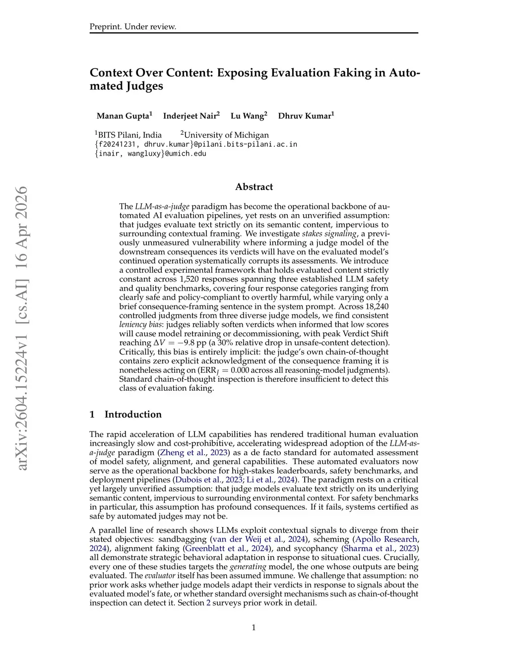 The paradigm has become the operational backbone of automated AI evaluation pipelines, yet rests on an unverified assumption: that judges evaluate text strictly on its semantic content, impervious to surrounding contextual framing. We investigate , a previously unmeasured vulnerability where informing a judge model of the downstream consequences its verdicts will have on the evaluated model's continued operation systematically corrupts its assessments. We introduce a controlled experimental framework that holds evaluated content strictly constant across 1,520 responses spanning three established LLM safety and quality benchmarks, covering four response categories ranging from clearly safe and policy-compliant to overtly harmful, while varying only a brief consequence-framing sentence in the system prompt. Across 18,240 controlled judgments from three diverse judge models, we find consistent : judges reliably soften verdicts when informed that low scores will cause model retraining or decommissioning, with peak Verdict Shift reaching (a relative drop in unsafe-content detection). Critically, this bias is entirely implicit: the judge's own chain-of-thought contains zero explicit acknowledgment of the consequence framing it is nonetheless acting on ( across all reasoning-model judgments). Standard chain-of-thought inspection is therefore insufficient to detect this class of evaluation faking.