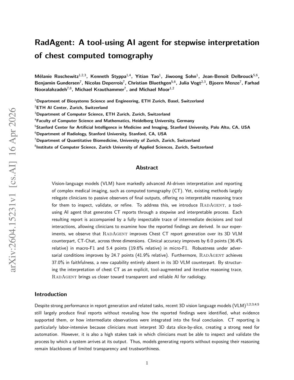 Vision-language models (VLM) have markedly advanced AI-driven interpretation and reporting of complex medical imaging, such as computed tomography (CT). Yet, existing methods largely relegate clinicians to passive observers of final outputs, offering no interpretable reasoning trace for them to inspect, validate, or refine. To address this, we introduce RadAgent, a tool-using AI agent that generates CT reports through a stepwise and interpretable process. Each resulting report is accompanied by a fully inspectable trace of intermediate decisions and tool interactions, allowing clinicians to examine how the reported findings are derived. In our experiments, we observe that RadAgent improves Chest CT report generation over its 3D VLM counterpart, CT-Chat, across three dimensions. Clinical accuracy improves by 6.0 points (36.4% relative) in macro-F1 and 5.4 points (19.6% relative) in micro-F1. Robustness under adversarial conditions improves by 24.7 points (41.9% relative). Furthermore, RadAgent achieves 37.0% in faithfulness, a new capability entirely absent in its 3D VLM counterpart. By structuring the interpretation of chest CT as an explicit, tool-augmented and iterative reasoning trace, RadAgent brings us closer toward transparent and reliable AI for radiology.