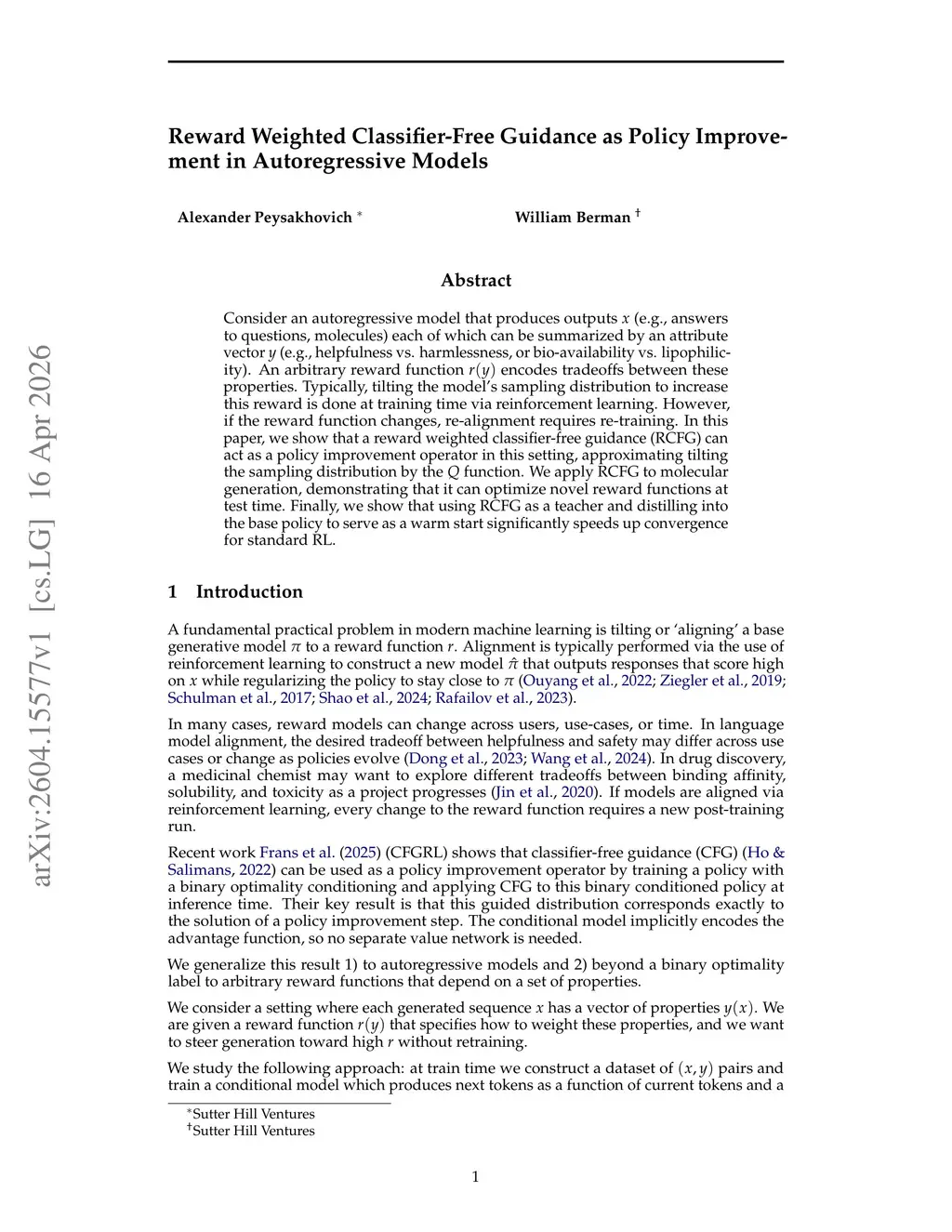 Consider an auto-regressive model that produces outputs x (e.g., answers to questions, molecules) each of which can be summarized by an attribute vector y (e.g., helpfulness vs. harmlessness, or bio-availability vs. lipophilicity). An arbitrary reward function r(y) encodes tradeoffs between these properties. Typically, tilting the model's sampling distribution to increase this reward is done at training time via reinforcement learning. However, if the reward function changes, re-alignment requires re-training. In this paper, we show that a reward weighted classifier-free guidance (RCFG) can act as a policy improvement operator in this setting, approximating tilting the sampling distribution by the Q function. We apply RCFG to molecular generation, demonstrating that it can optimize novel reward functions at test time. Finally, we show that using RCFG as a teacher and distilling into the base policy to serve as a warm start significantly speeds up convergence for standard RL.