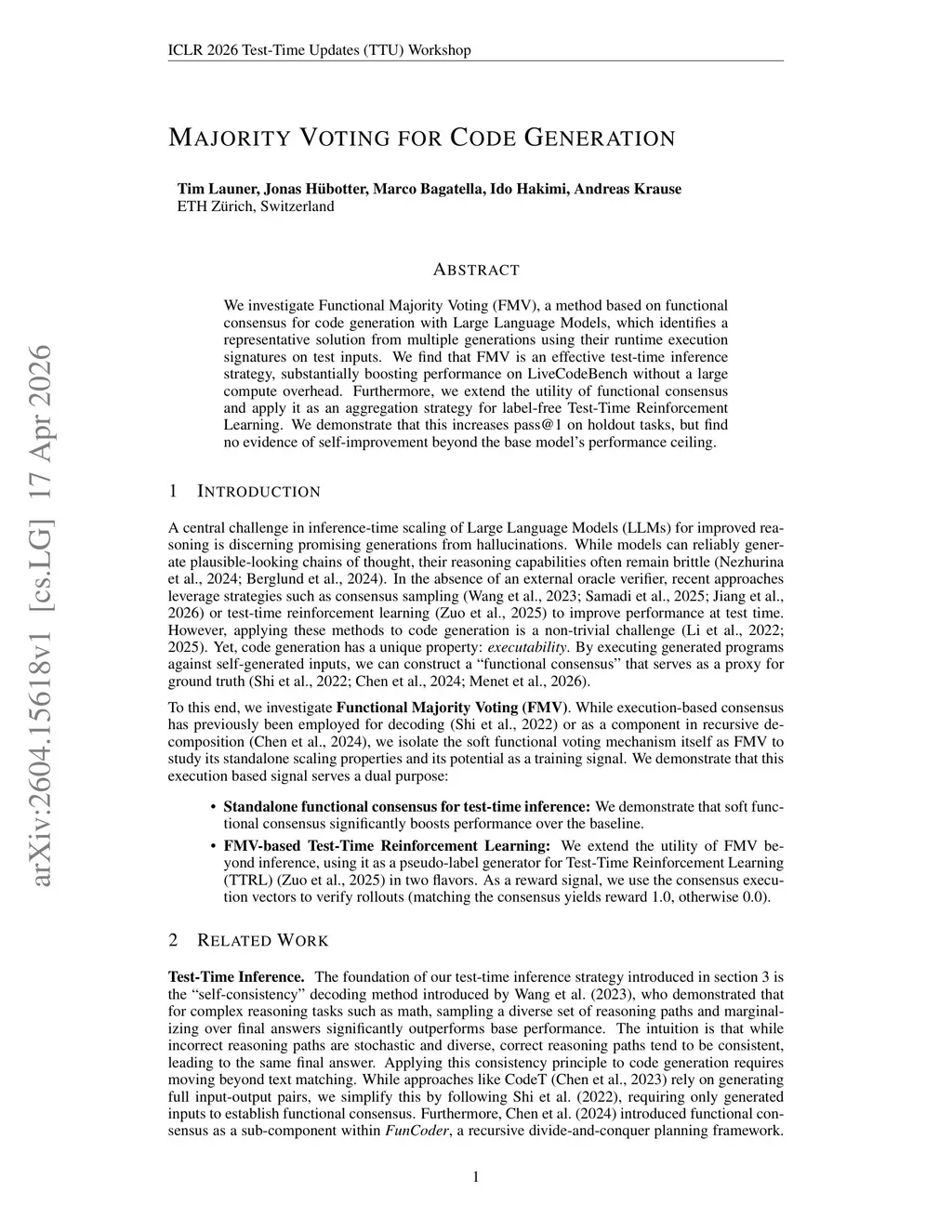 We investigate Functional Majority Voting (FMV), a method based on functional consensus for code generation with Large Language Models, which identifies a representative solution from multiple generations using their runtime execution signatures on test inputs. We find that FMV is an effective test-time inference strategy, substantially boosting performance on LiveCodeBench without a large compute overhead. Furthermore, we extend the utility of functional consensus and apply it as an aggregation strategy for label-free Test-Time Reinforcement Learning. We demonstrate that this increases pass@1 on holdout tasks, but find no evidence of self-improvement beyond the base model's performance ceiling.