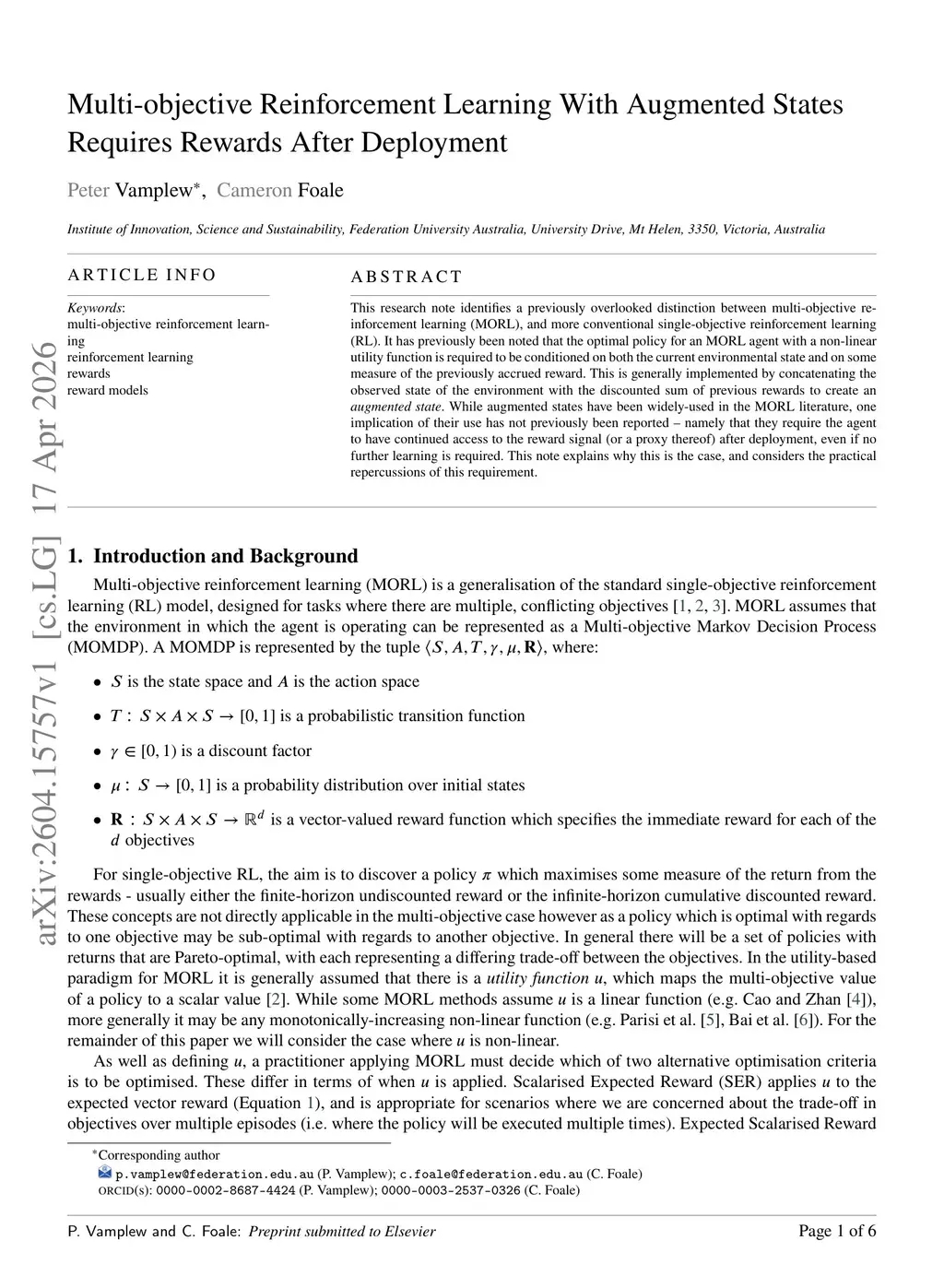 This research note identifies a previously overlooked distinction between multi-objective reinforcement learning (MORL), and more conventional single-objective reinforcement learning (RL). It has previously been noted that the optimal policy for an MORL agent with a non-linear utility function is required to be conditioned on both the current environmental state and on some measure of the previously accrued reward. This is generally implemented by concatenating the observed state of the environment with the discounted sum of previous rewards to create an augmented state. While augmented states have been widely-used in the MORL literature, one implication of their use has not previously been reported -- namely that they require the agent to have continued access to the reward signal (or a proxy thereof) after deployment, even if no further learning is required. This note explains why this is the case, and considers the practical repercussions of this requirement.