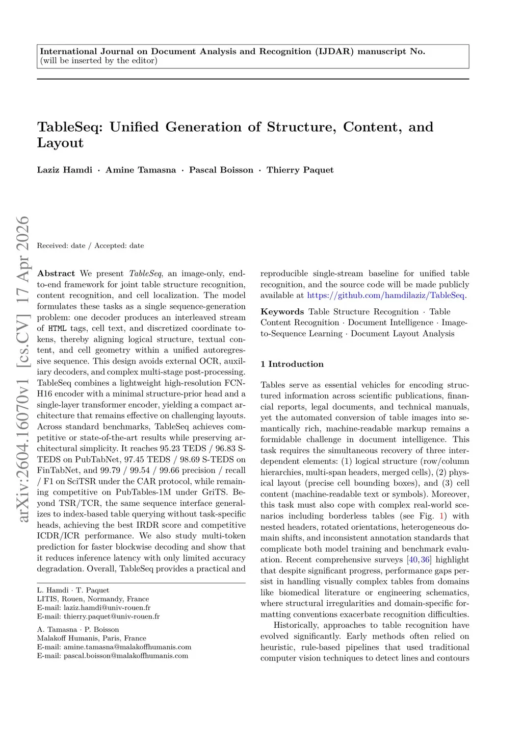 We present TableSeq, an image-only, end-to-end framework for joint table structure recognition, content recognition, and cell localization. The model formulates these tasks as a single sequence-generation problem: one decoder produces an interleaved stream of \texttt{HTML} tags, cell text, and discretized coordinate tokens, thereby aligning logical structure, textual content, and cell geometry within a unified autoregressive sequence. This design avoids external OCR, auxiliary decoders, and complex multi-stage post-processing. TableSeq combines a lightweight high-resolution FCN-H16 encoder with a minimal structure-prior head and a single-layer transformer encoder, yielding a compact architecture that remains effective on challenging layouts. Across standard benchmarks, TableSeq achieves competitive or state-of-the-art results while preserving architectural simplicity. It reaches 95.23 TEDS / 96.83 S-TEDS on PubTabNet, 97.45 TEDS / 98.69 S-TEDS on FinTabNet, and 99.79 / 99.54 / 99.66 precision / recall / F1 on SciTSR under the CAR protocol, while remaining competitive on PubTables-1M under GriTS. Beyond TSR/TCR, the same sequence interface generalizes to index-based table querying without task-specific heads, achieving the best IRDR score and competitive ICDR/ICR performance. We also study multi-token prediction for faster blockwise decoding and show that it reduces inference latency with only limited accuracy degradation. Overall, TableSeq provides a practical and reproducible single-stream baseline for unified table recognition, and the source code will be made publicly available atthis https URL.