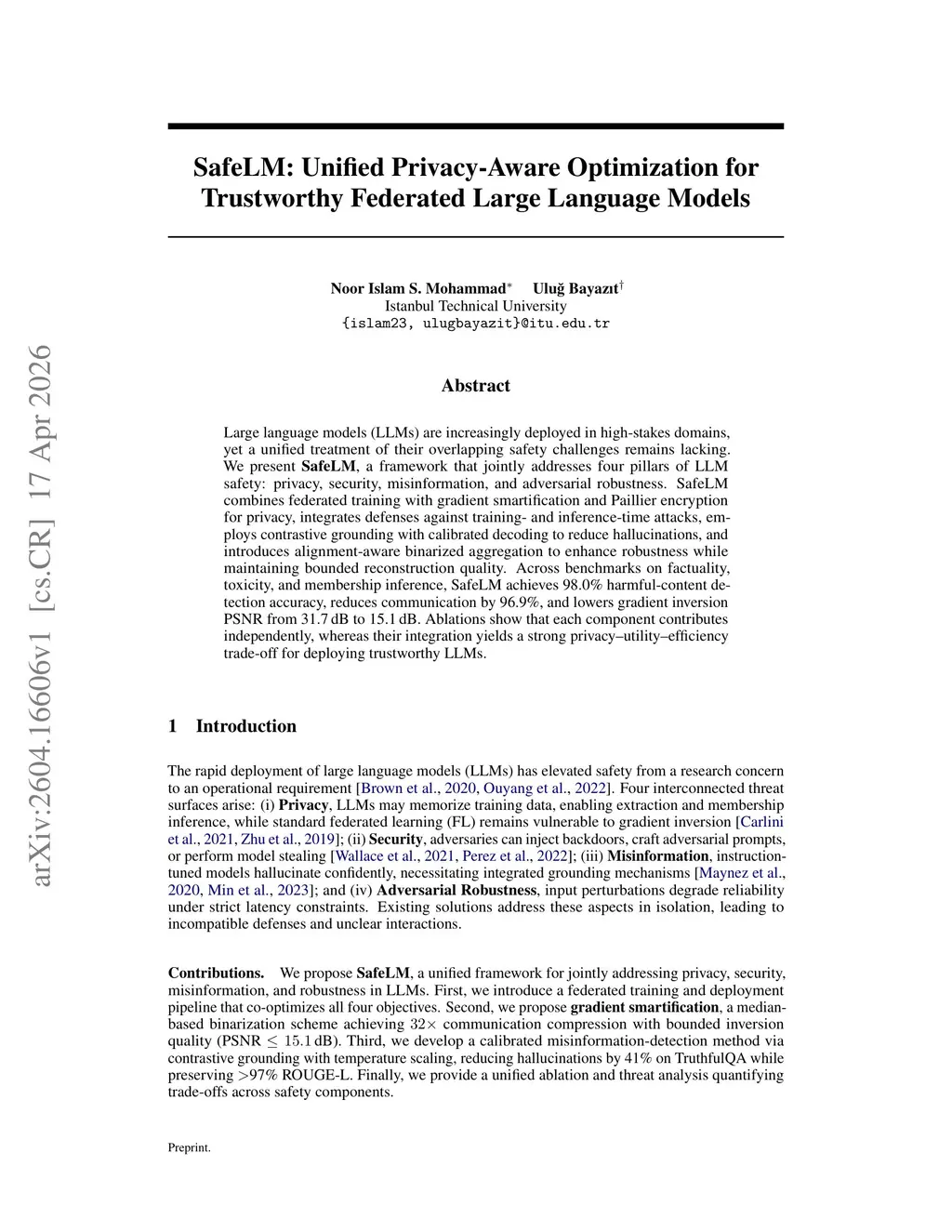 Large language models (LLMs) are increasingly deployed in high-stakes domains, yet a unified treatment of their overlapping safety challenges remains lacking. We present SafeLM, a framework that jointly addresses four pillars of LLM safety: privacy, security, misinformation, and adversarial robustness. SafeLM combines federated training with gradient smartification and Paillier encryption for privacy, integrates defenses against training and inference-time attacks, employs contrastive grounding with calibrated decoding to reduce hallucinations, and introduces alignment-aware binarized aggregation to enhance robustness while maintaining bounded reconstruction quality. Across benchmarks on factuality, toxicity, and membership inference, SafeLM achieves 98.0% harmful content detection accuracy, reduces communication by 96.9%, and lowers gradient inversion PSNR from 31.7 dB to 15.1 dB. Ablations show that each component contributes independently, whereas their integration yields a strong privacy utility efficiency trade-off for deploying trustworthy LLMs.