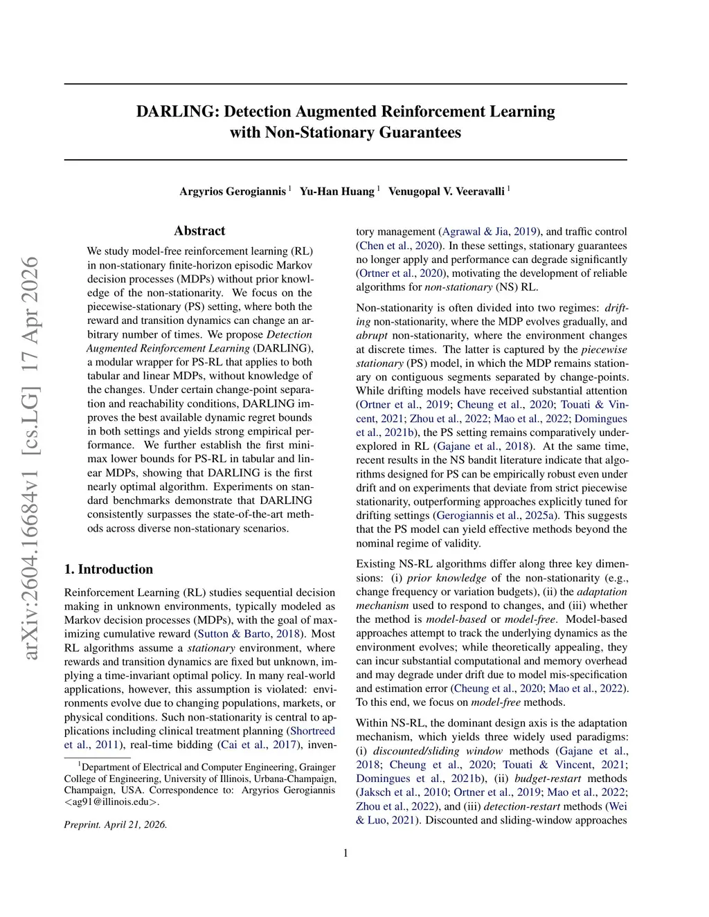 DARLING: Detection Augmented Reinforcement Learning with Non-Stationary Guarantees