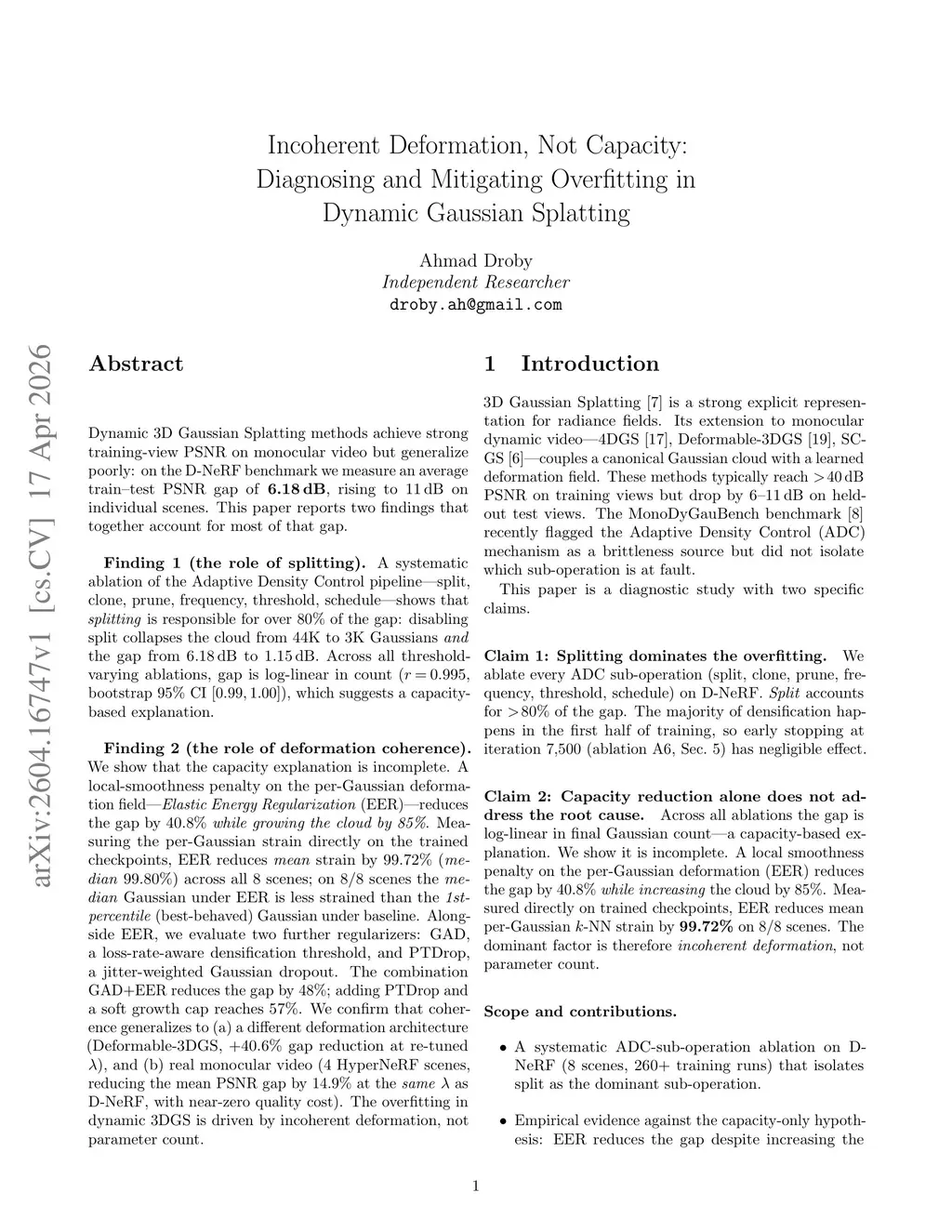 Dynamic 3D Gaussian Splatting methods achieve strong training-view PSNR on monocular video but generalize poorly: on the D-NeRF benchmark we measure an average train-test PSNR gap of 6.18 dB, rising to 11 dB on individual scenes. We report two findings that together account for most of that gap.Finding 1 (the role of splitting). A systematic ablation of the Adaptive Density Control pipeline (split, clone, prune, frequency, threshold, schedule) shows that splitting is responsible for over 80% of the gap: disabling split collapses the cloud from 44K to 3K Gaussians and the gap from 6.18 dB to 1.15 dB. Across all threshold-varying ablations, gap is log-linear in count (r = 0.995, bootstrap 95% CI [0.99, 1.00]), which suggests a capacity-based explanation.Finding 2 (the role of deformation coherence). We show that the capacity explanation is incomplete. A local-smoothness penalty on the per-Gaussian deformation field -- Elastic Energy Regularization (EER) -- reduces the gap by 40.8% while growing the cloud by 85%. Measuring per-Gaussian strain directly on trained checkpoints, EER reduces mean strain by 99.72% (median 99.80%) across all 8 scenes; on 8/8 scenes the median Gaussian under EER is less strained than the 1st-percentile (best-behaved) Gaussian under baseline. Alongside EER, we evaluate two further regularizers: GAD, a loss-rate-aware densification threshold, and PTDrop, a jitter-weighted Gaussian dropout. GAD+EER reduces the gap by 48%; adding PTDrop and a soft growth cap reaches 57%. We confirm that coherence generalizes to (a) a different deformation architecture (Deformable-3DGS, +40.6% gap reduction at re-tuned lambda), and (b) real monocular video (4 HyperNeRF scenes, reducing the mean PSNR gap by 14.9% at the same lambda as D-NeRF, with near-zero quality cost). The overfitting in dynamic 3DGS is driven by incoherent deformation, not parameter count.
