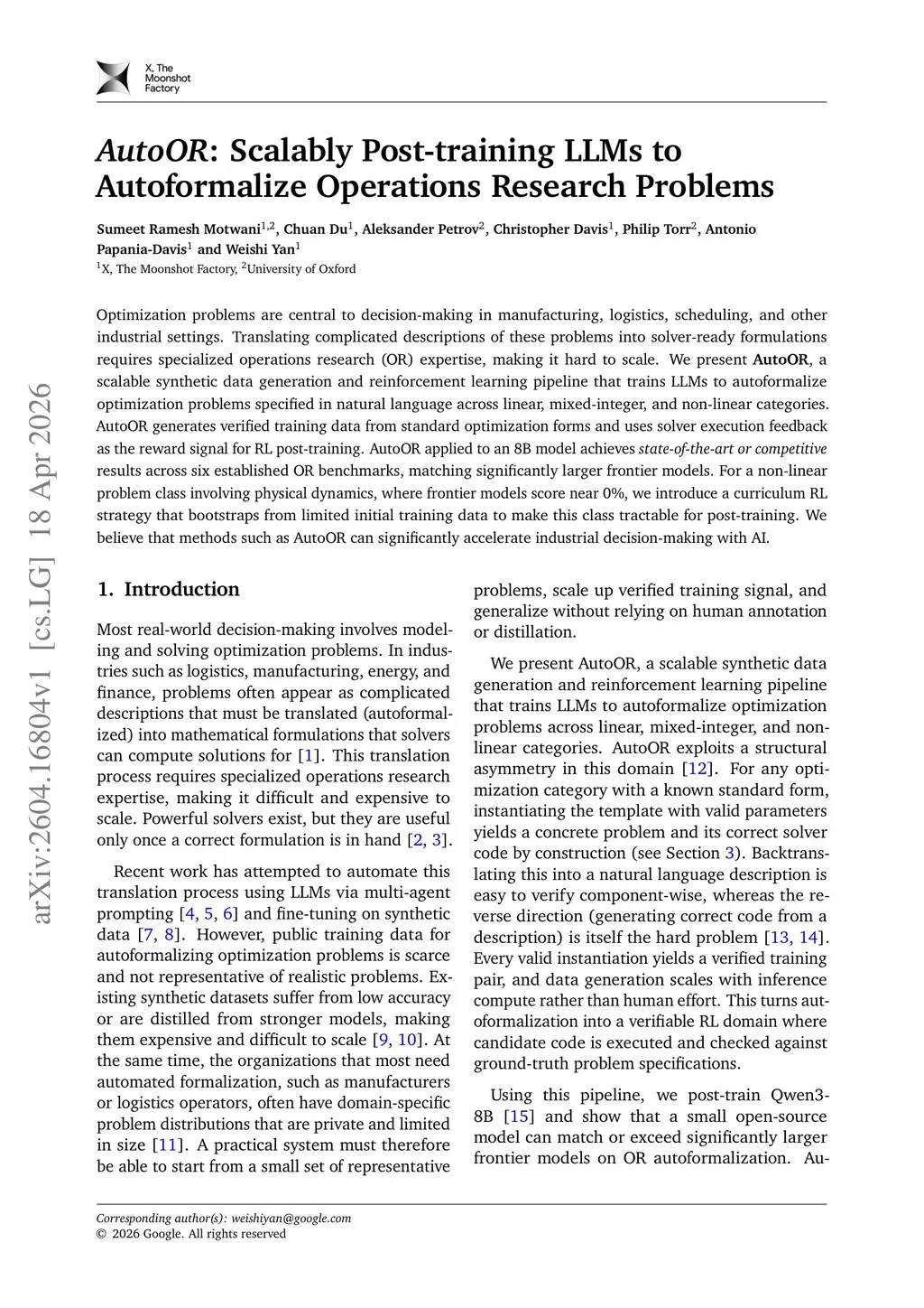 Optimization problems are central to decision-making in manufacturing, logistics, scheduling, and other industrial settings. Translating complicated descriptions of these problems into solver-ready formulations requires specialized operations research (OR) expertise, making it hard to scale. We present AutoOR, a scalable synthetic data generation and reinforcement learning pipeline that trains LLMs to autoformalize optimization problems specified in natural language across linear, mixed-integer, and non-linear categories. AutoOR generates verified training data from standard optimization forms and uses solver execution feedback as the reward signal for RL post-training. AutoOR applied to an 8B model achieves state-of-the-art or competitive results across six established OR benchmarks, matching significantly larger frontier models. For a non-linear problem class involving physical dynamics, where frontier models score near 0%, we introduce a curriculum RL strategy that bootstraps from limited initial training data to make this class tractable for post-training. We believe that methods such as AutoOR can significantly accelerate industrial decision-making with AI.
