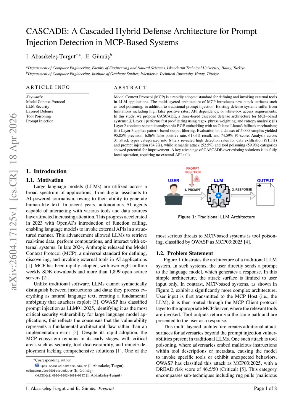 Model Context Protocol (MCP) is a rapidly adopted standard for defining and invoking external tools in LLM applications. The multi-layered architecture of MCP introduces new attack surfaces such as tool poisoning, in addition to traditional prompt injection. Existing defense systems suffer from limitations including high false positive rates, API dependency, or white-box access requirements. In this study, we propose CASCADE, a three-tiered cascaded defense architecture for MCP-based systems: (i) Layer 1 performs fast pre-filtering using regex, phrase weighting, and entropy analysis; (ii) Layer 2 conducts semantic analysis via BGE embedding with an Ollama Llama3 fallback mechanism; (iii) Layer 3 applies pattern-based output filtering. Evaluation on a dataset of 5,000 samples yielded 95.85% precision, 6.06% false positive rate, 61.05% recall, and 74.59% F1-score. Analysis across 31 attack types categorized into 6 tiers revealed high detection rates for data exfiltration (91.5%) and prompt injection (84.2%), while semantic attack (52.5%) and tool poisoning (59.9%) categories showed potential for improvement. A key advantage of CASCADE over existing solutions is its fully local operation, requiring no external API calls